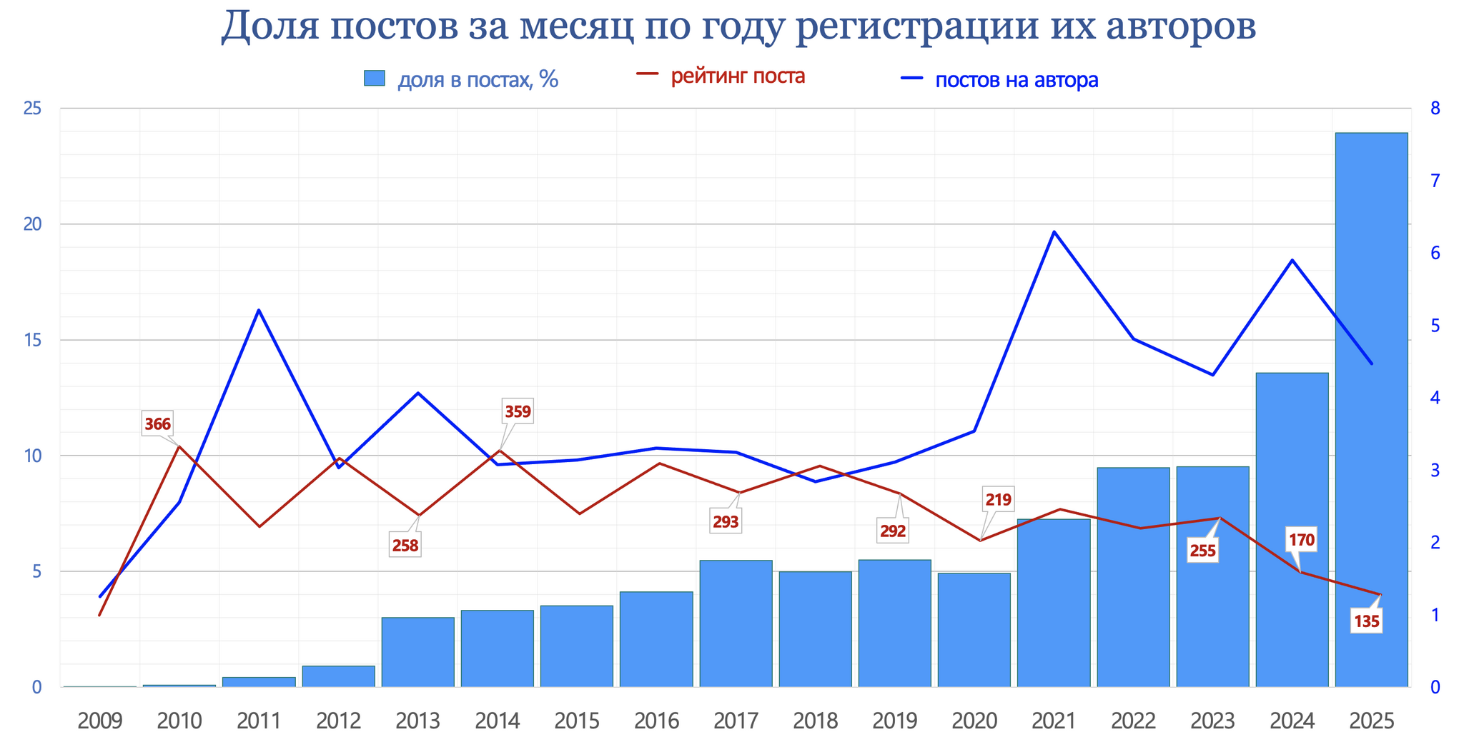 32 171 (32,1% постов, на 4,7% больше предыдущего месяца), написанных 35,6% от всех авторов с постами, попали в Горячее.