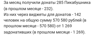 Из них через виджеты для донатов - 144 человек на общую сумму 454 685 рублей (в прошлом месяце - 570 580) от 917 задонативших (в прошлом месяце - 1 269).