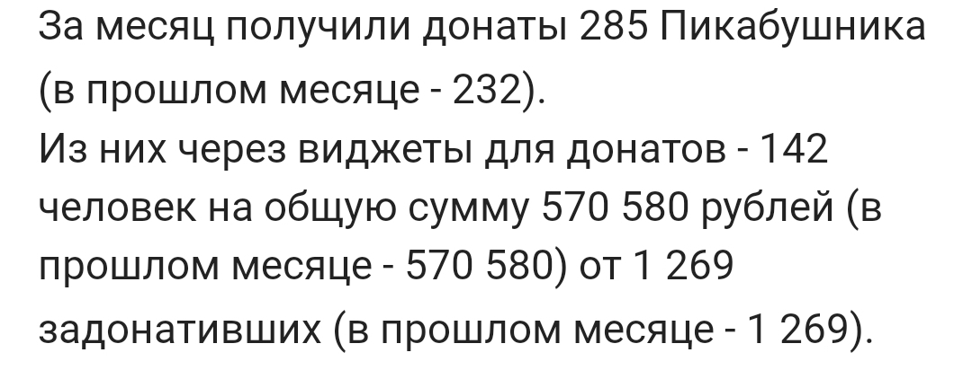 За месяц получили донаты 285 Пикабушника (в прошлом месяце - 232).