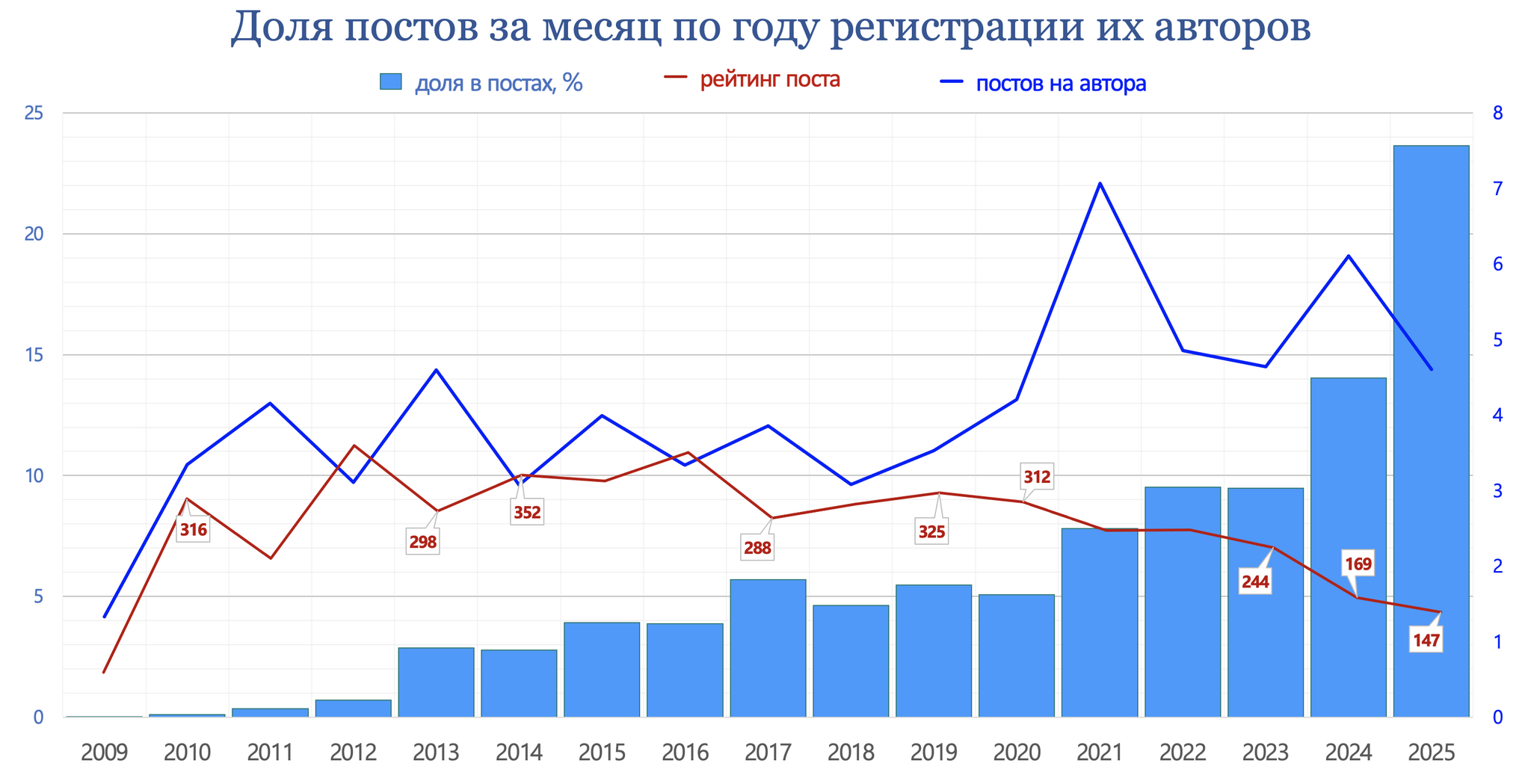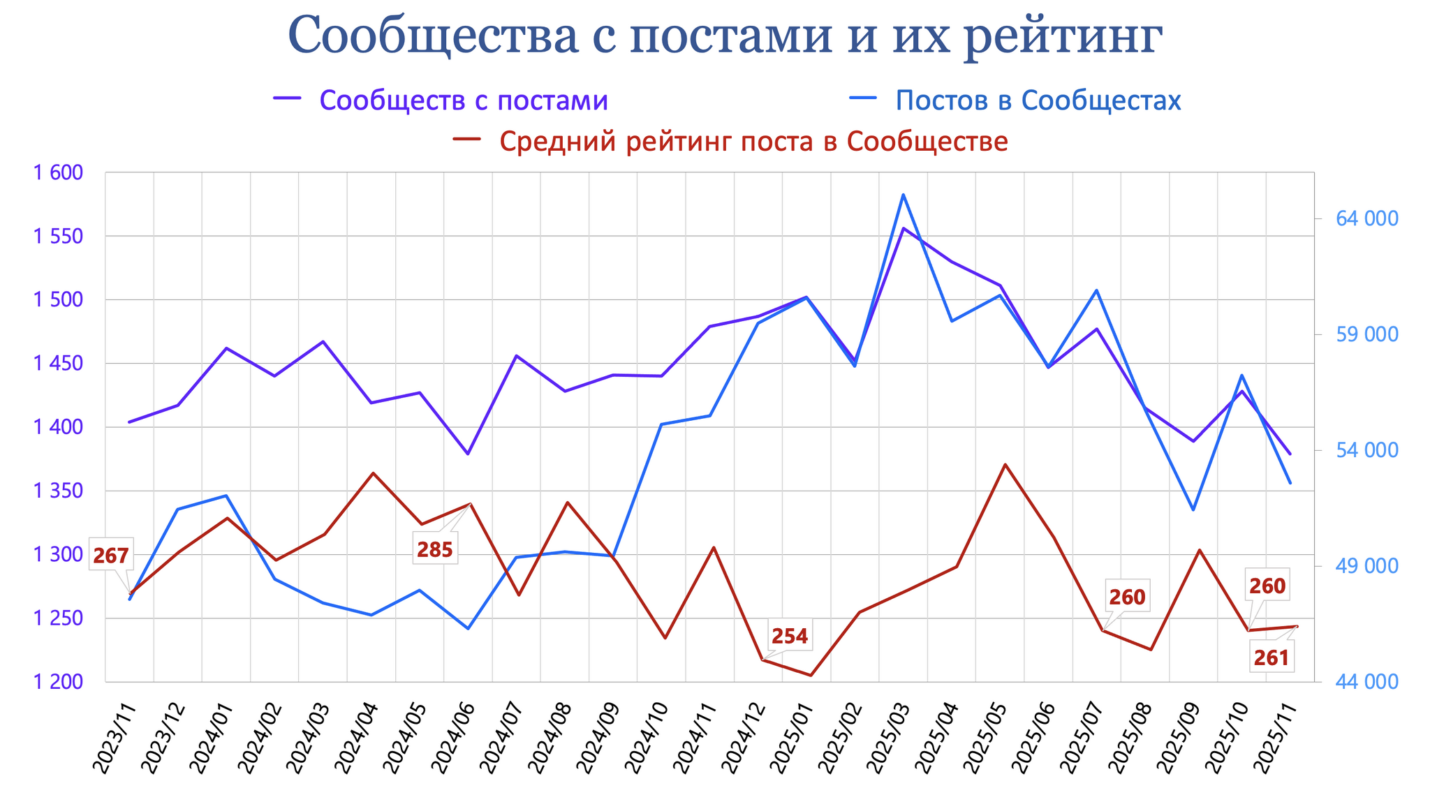 Из 101 380 постов, написанных в ноябре, имели рейтинг выше 10 000 - 120, от 5 000 до 10 000 - 690 (0,7%), от 1 000 до 5 000 - 4 990 (5,2%), от 100 до 1 000 - 15 685 (16,3%), от 0 до 100 - 58 339 (60,6%), с отрицательным - 16 435 (17,1%).