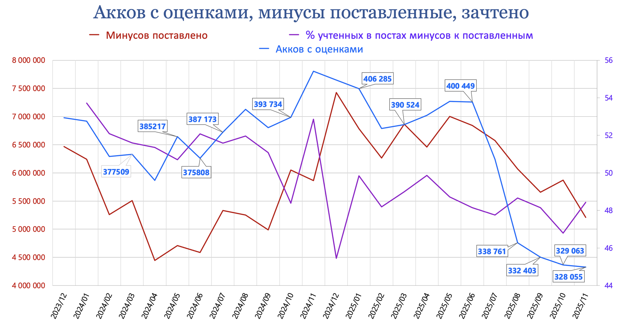 На конец месяца удалили свои аккаунты и не вернулись 1 590 пользователей (в прошлом месяце - 1 563). Восстановили аккаунты 343 (в прошлом месяце - 302). Переименовали свои акки 141 (в прошлом - 151).