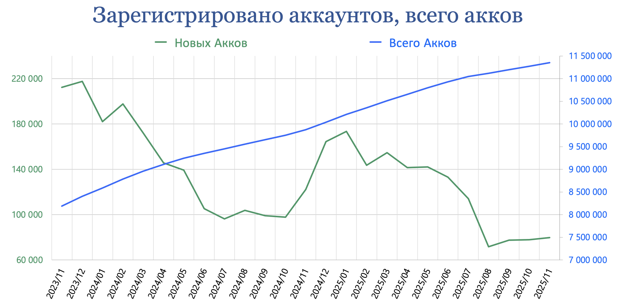 В ноябре на Ресурсе зарегистрировалось 80 178 Пользователей (на 1 835 больше к предыдущему месяцу) и всего их стало 11 356 067.