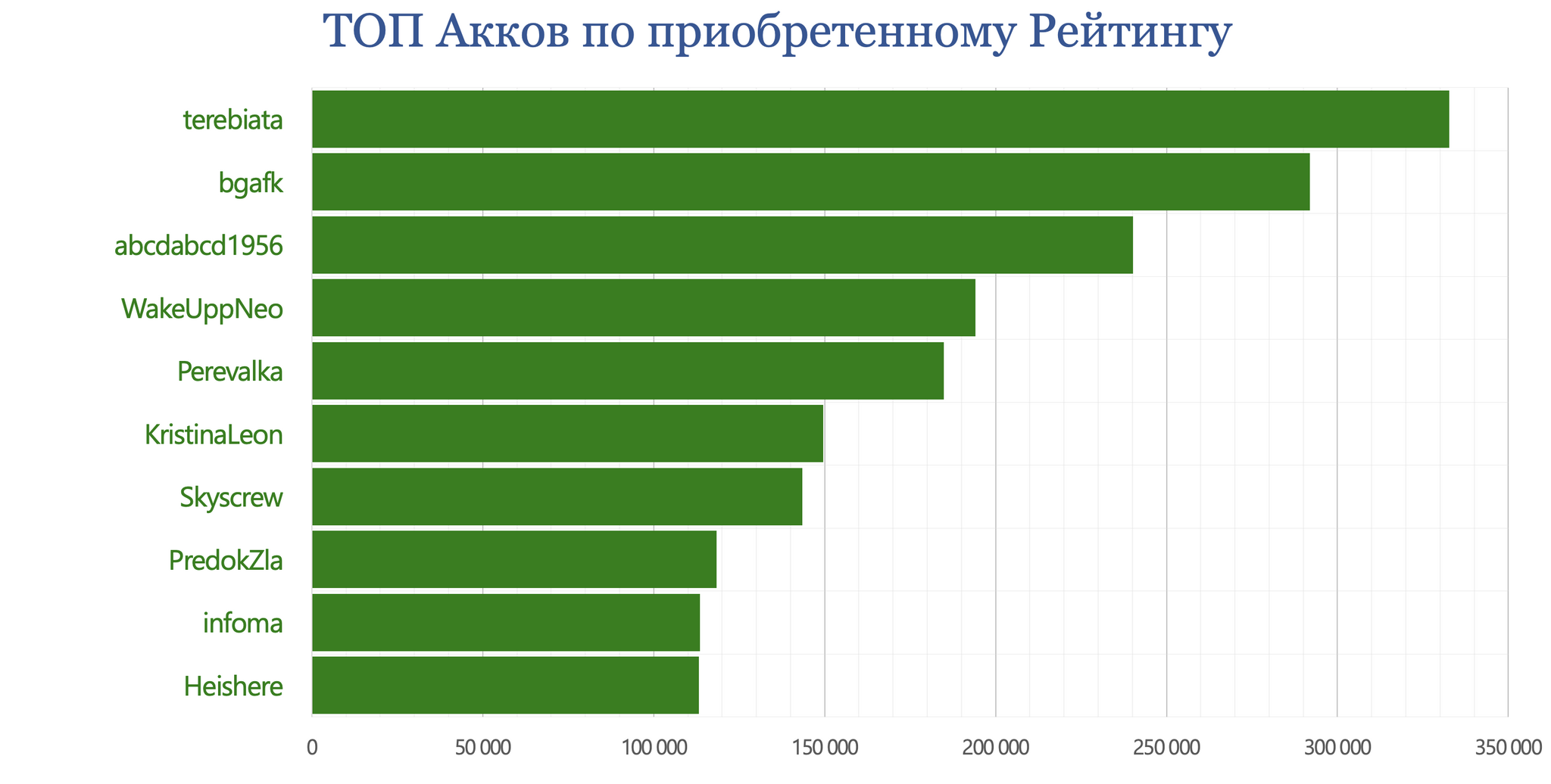 Kotbeg0 - постов опубликовано 360, рейтинг за них 48 875; unskilid - постов 357, рейтинг за них 95 511; terebiata - постов 347, рейтинг 340 760; A.Kristina - постов 330, рейтинг 29 532; NeprChic - постов 330, рейтинг 14 594; autopicabu - постов 330, рейтинг 106 245; Vprazdnik - постов 321, рейтинг 108 840; ED400 - постов 317, рейтинг 245; Heishere - постов 306, рейтинг 118 521; bgafk - постов 297, рейтинг 294 027.