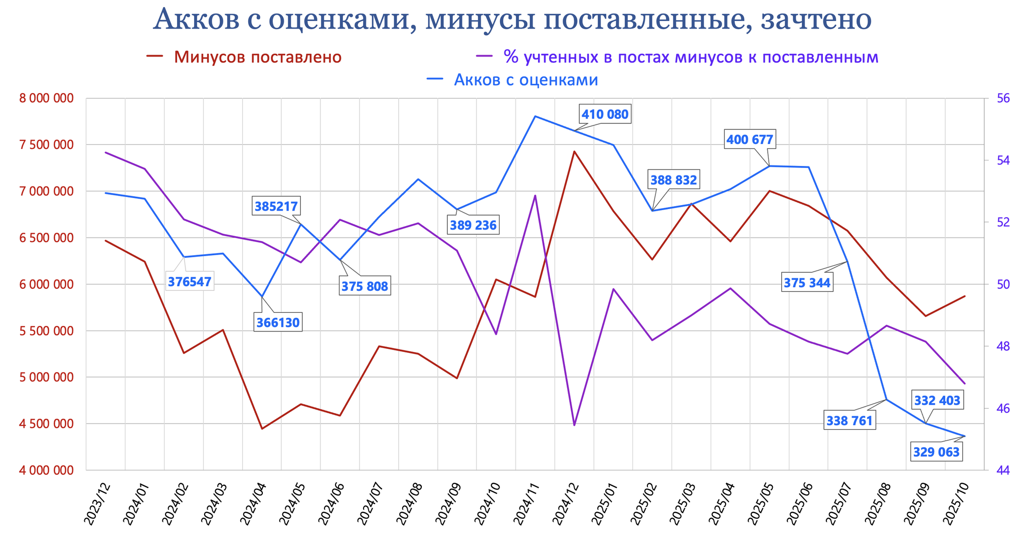 На конец месяца удалили свои аккаунты и не вернулись 1 563 пользователей (в прошлом месяце - 1 746). Восстановили аккаунты 302 (в прошлом месяце - 300). Переименовали свои акки 151 (в прошлом - 144).