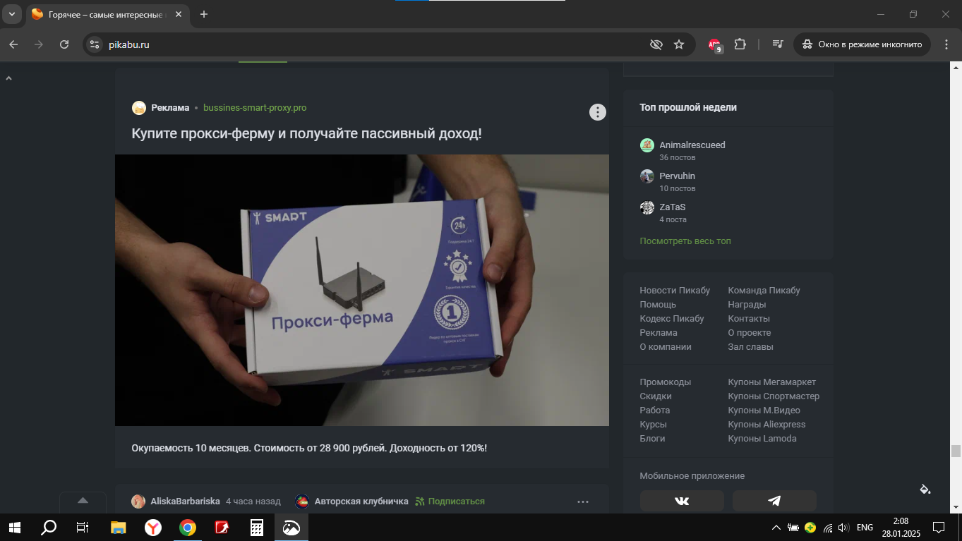 4 Есть официальный ответ sibkatastrofa Реклама на Пикабу Пикабу, народ, что это такое? Это законно? 9 месяцев назад Листаю, родной Пикабу, а тут такое. Может я зря тревожусь, и всё нормально, но уж больно похожа она на устройство для пересылки хрен пойми чьего трафика, не факт что законного, а за это обещают нормальную копейку. Поправьте меня, если я не прав. Негодование Реклама на Пикабу Информационная безопасность 1 Ещё 0