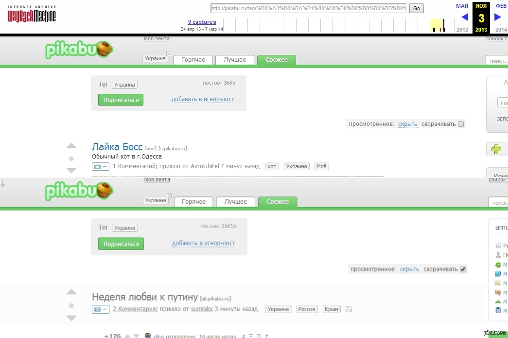 amok10 11 лет назад Пикабу. Сейчас и до. А помните те времена, когда тег "Украина" и "Кот" могли идти вместе? Украина Пикабу Скриншот