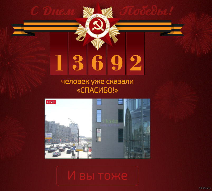 domingo Пикабу, скажем Спасибо ветеранам? 10 лет назад Для тех, у кого нет возможности выйти на улицу 9 мая :) Количество "спасибо" проецируется на Садовом кольце в Москве 9 мая - День Победы Спасибо