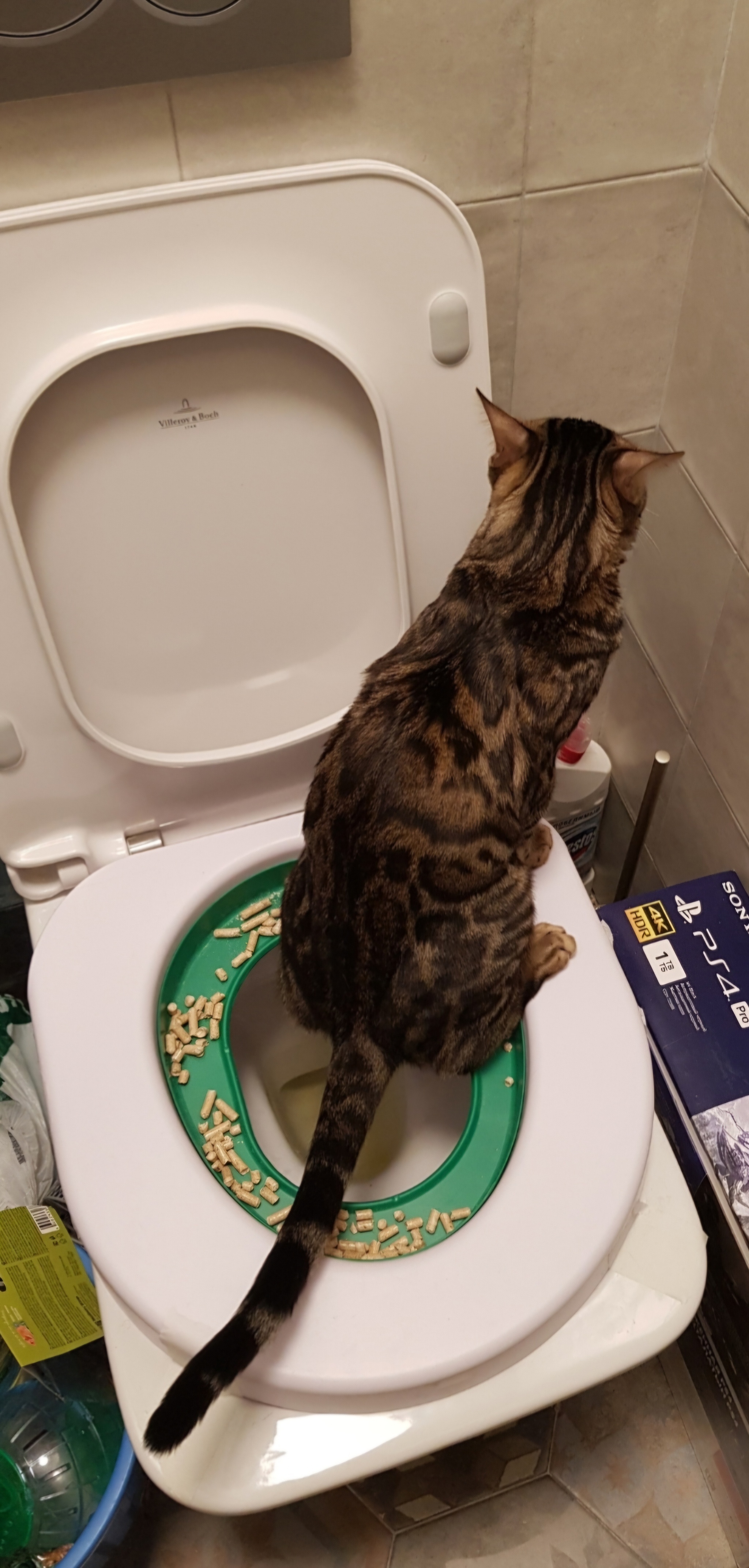 на следующем этапе начались проблемы. дырка еще шире, остался один бортик с опилками. но пока я накладывал опилки во весь бортик, он их раскидывал как следует вокруг и гадил на бортик, в выкопанную ямку. иногда, уже случайно, попадал в дырку унитаза. со временем, как я заметил, начал учиться присаживаться правильно, свесив жопку в дырку. этот этап был недели 3, кот учился ходить по бортику, присаживаться, и у него получалось все лучше и лучше, а я постепенно уменьшал количество опилок, стал класть вместо гранул обычные опилки (он их все равно в стороны расшвыривает).