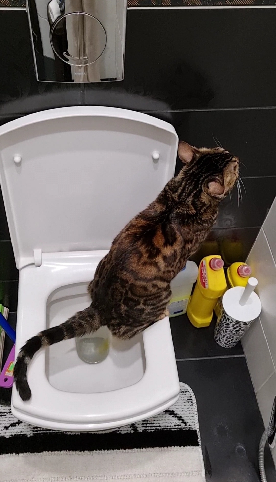 уточню, что кот не боиться унитаза, он туда с интересом залезает прямо внутрь, ну это на фотках выше. кот не боиться воды в унитазе, он ее вообще не особо боиться, например, залезает в мокрый душевой поддон, в лужу воды. просто так. он не боиться упасть с унитаза, он туда легко запрыгивает с пола, в том числе и на сам узкий керамический ободок унитаза, а у него там сверху еще широкий стульчак, а рядом стульчик, чтобы можно было на нем стоять всеми лапами, в дырку только хвост выставив. "поцелуев нептуна" вроде тоже не случалось.