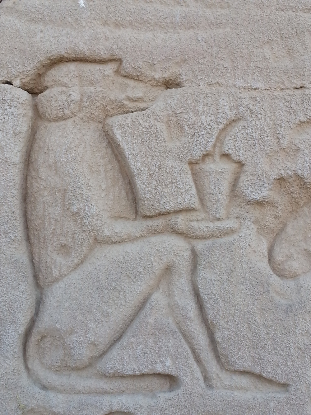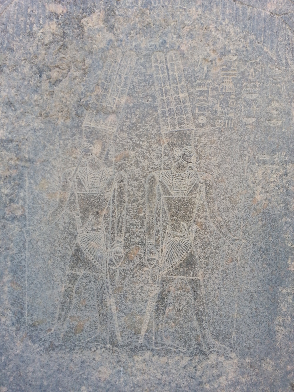 Может быть, Вы мне поможете. За 8 экскурсий в Луксор, ни один гид не сказал мне ничего связного в отношении этого камня. Он стоит сразу после входа в Карнакский храм у аллеи баранов. Сантиметров 70. На нем фактически зеркальное изображение Осириса (?). Жаль, фотографии только такие.