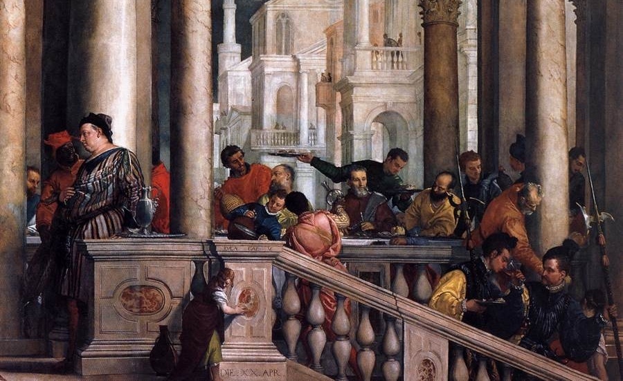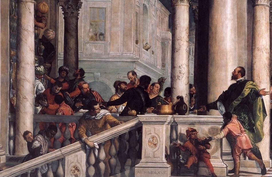...Творение, которое больше напоминает роскошный венецианский банкет, чем скромную трапезу в Иерусалиме. Пять с половиной метров в высоту, почти тринадцать в длину – это вам не картина, это целая площадь под крышей! Под величественными аркадами (будто перенесенными прямиком из палаццо какого-нибудь дожа) Веронезе усадил не скромную дюжину апостолов, а целую толпу – больше сотни персонажей. В центре, конечно, Христос с учениками. Но главное действо – вокруг. Слуги несут горы дичи и фруктов, важно шествует мавр с кувшином, стоят на посту бравые ландскнехты с алебардами (те самые будущие «пьяные немцы» инквизиции), карлик демонстрирует яркого попугая (непременный атрибут роскоши эпохи!), а один слуга... отчаянно пытается остановить носовое кровотечение (видимо, переволновался от масштаба мероприятия). Под столами снуют дети, собаки и даже кошка. А в левом углу, скромным свидетелем, вероятно, пристроился и сам мастер – Паоло Веронезе. Тайная вечеря? Скорее, грандиозный прием в лучших венецианских традициях!