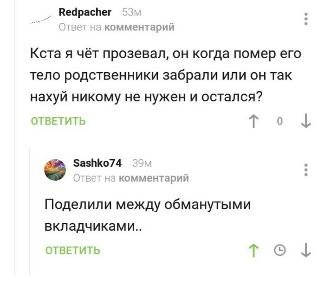 avatariche1 Баяны Пирамида#2 6 лет назад К посту https://pikabu.ru/story/piramida_6770981 Сергей Мавроди Пирамида Юмор Финансовая пирамида