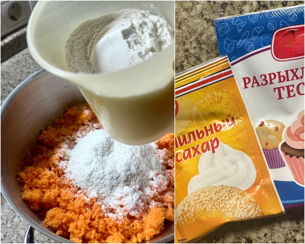 И как в той сказке: морковку во вспененную сахарно яичную смесь, муку с добавками в морковку. Перемешал аккуртано, но тщательно. Добавил пару ложек хорошего оливкового масла, апельсиновой цедры счистил с живого апельсина примерно две трети чайной ложки. И всё в смесь пошло.