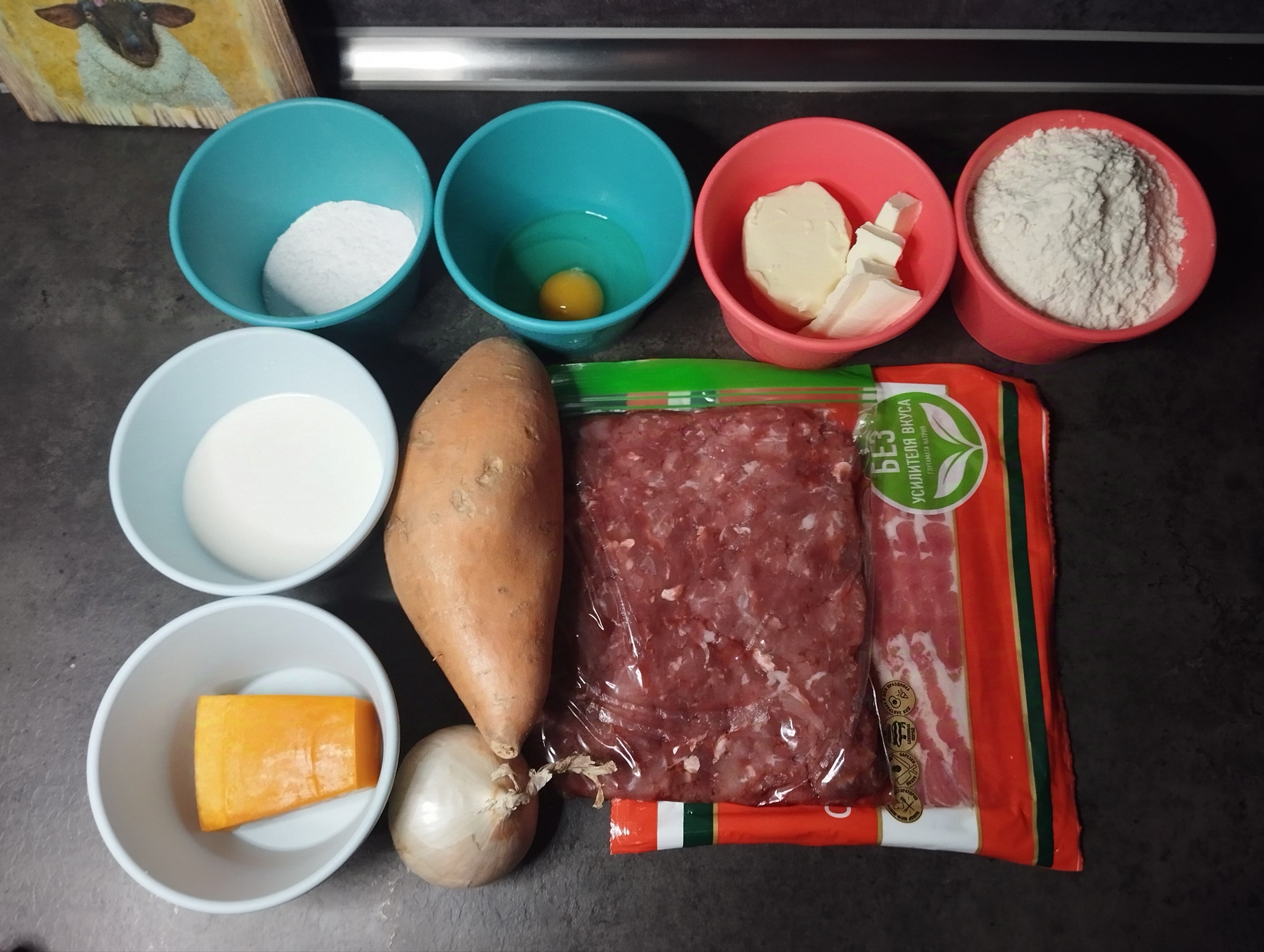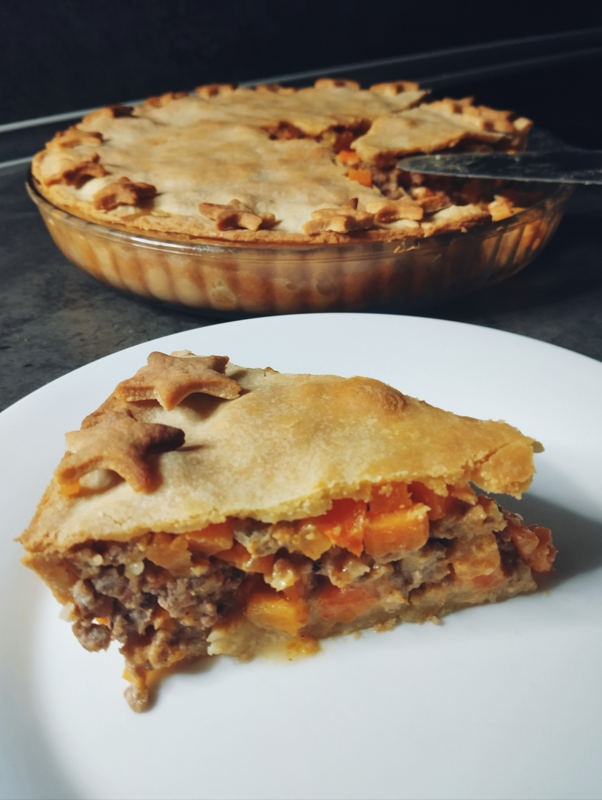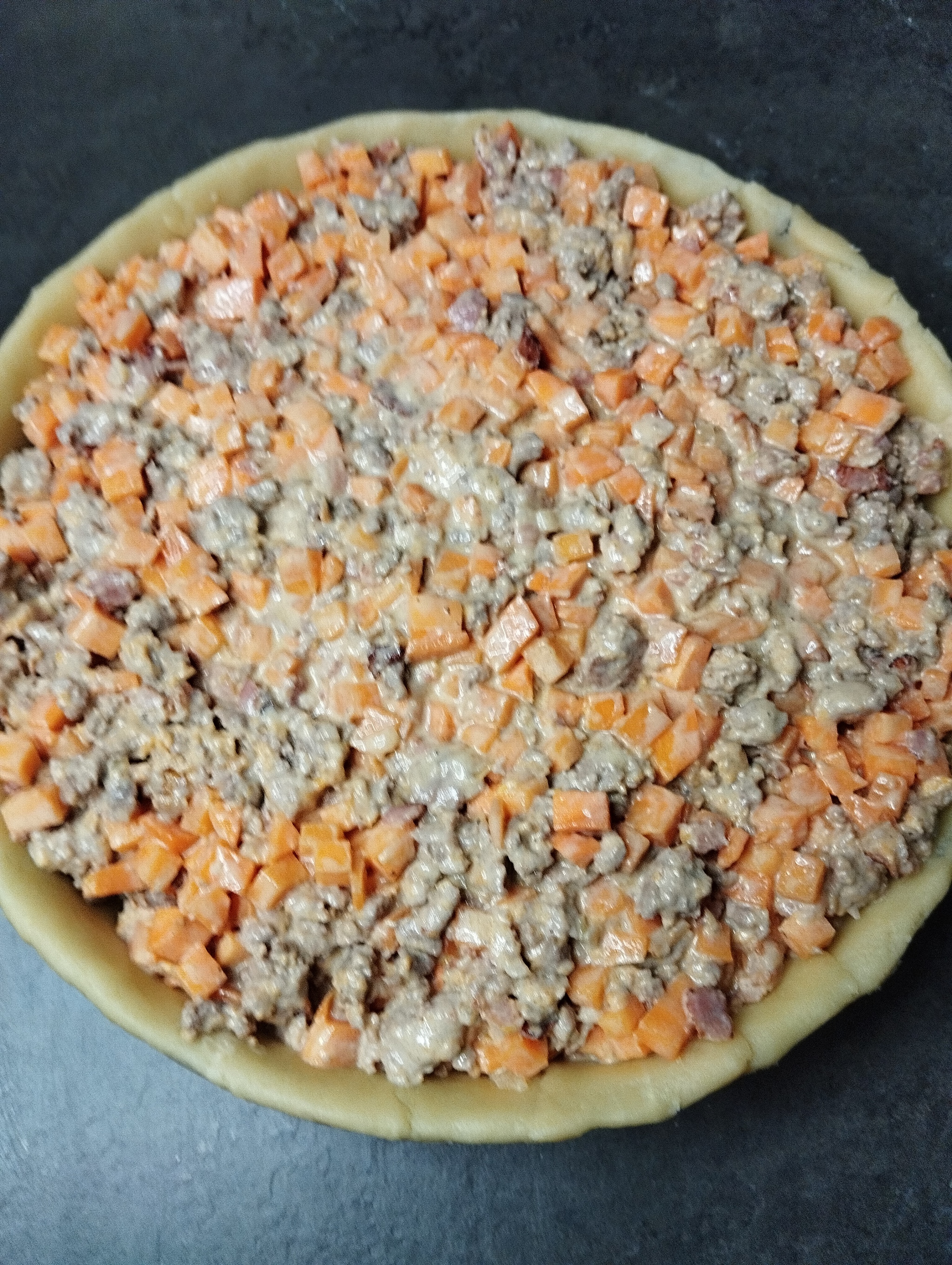 Пирог с бататом, фаршем и беконом