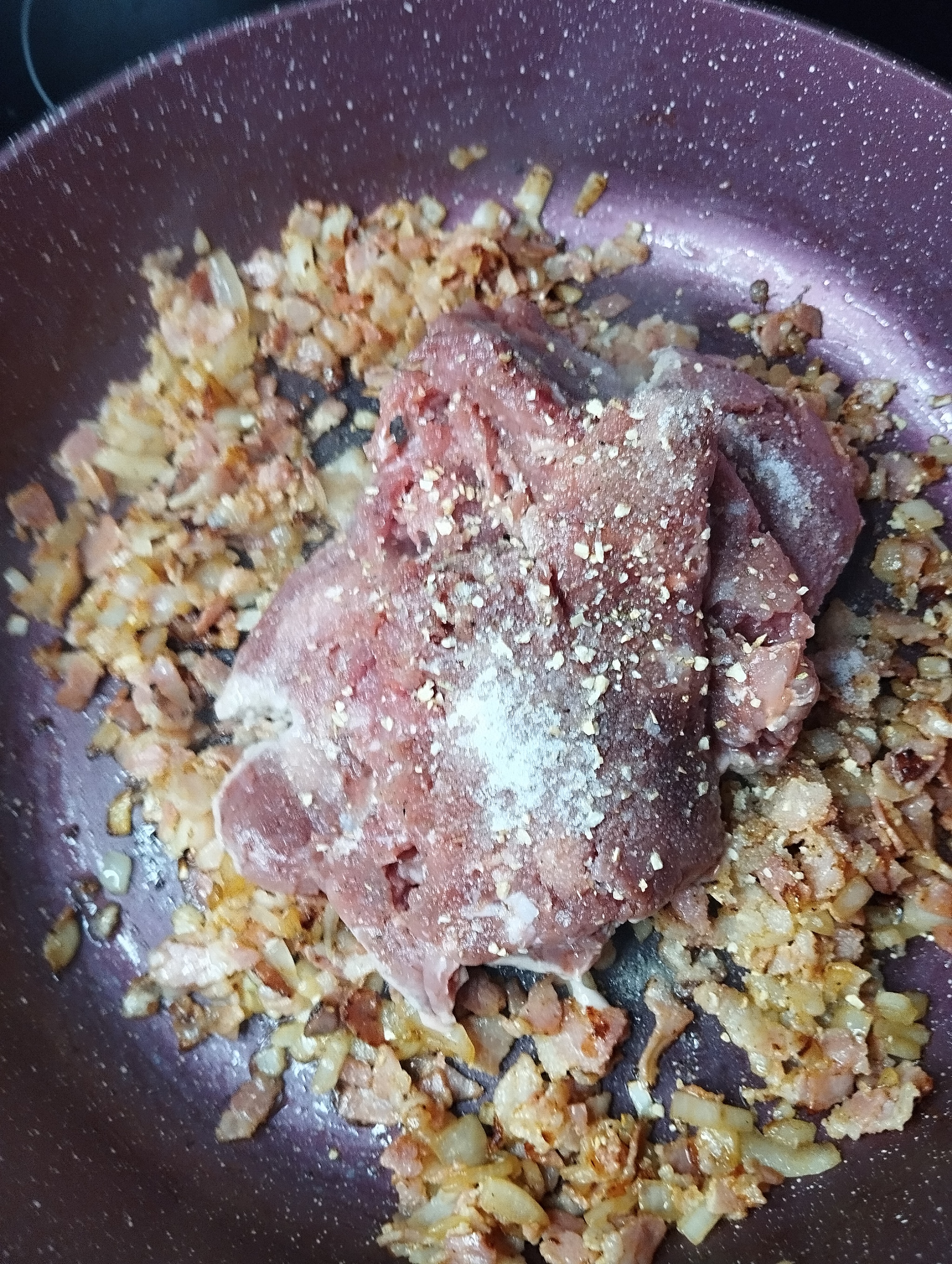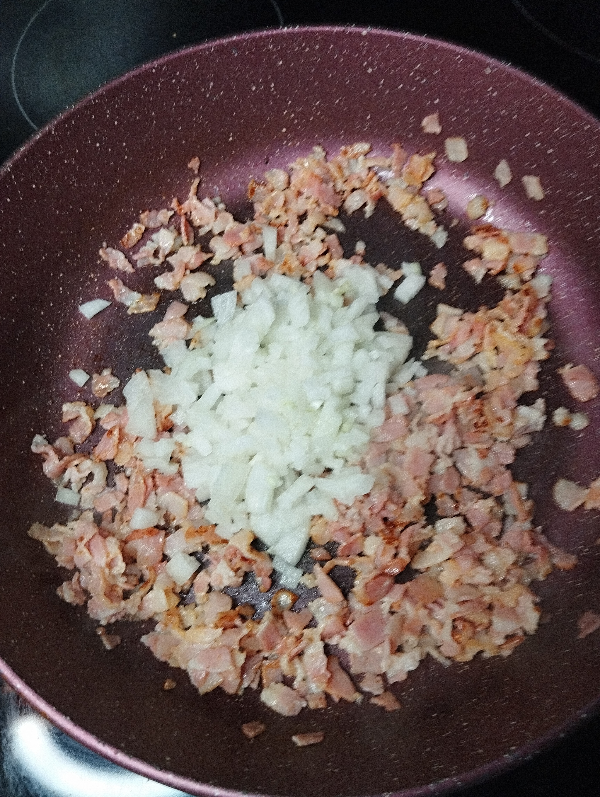 Для начинки мелко нарезаем бекон и отправляем на сковородку. Далее режем лук мелким кубиком и отправляем к бекону. Жарим пока лук не станет золотистым.
