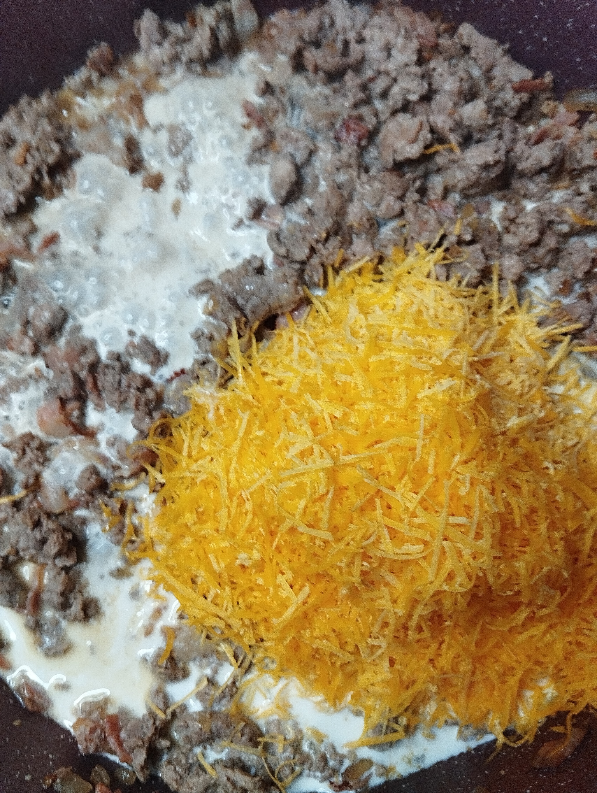 Обжариваем фарш почти до готовности, а затем добавляем сливки и тертый чеддер (думаю, что тереть сыр все умеют, и этот шаг дополнительно иллюстрировать не обязательно))
