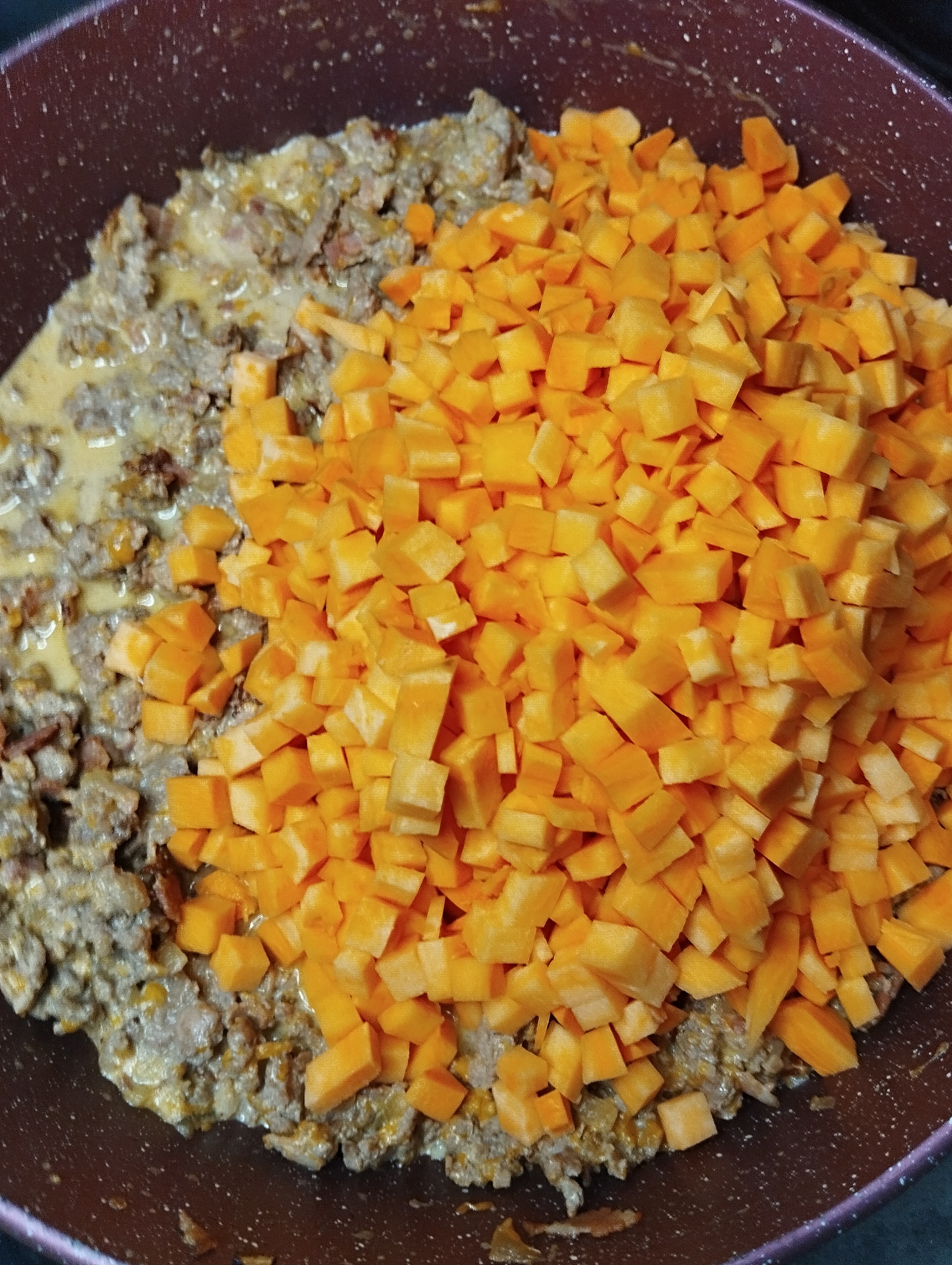 Даем сыру раствориться в сливках. Режем батат мелким кубиком и отправляем на сковородку к остальной начинке.