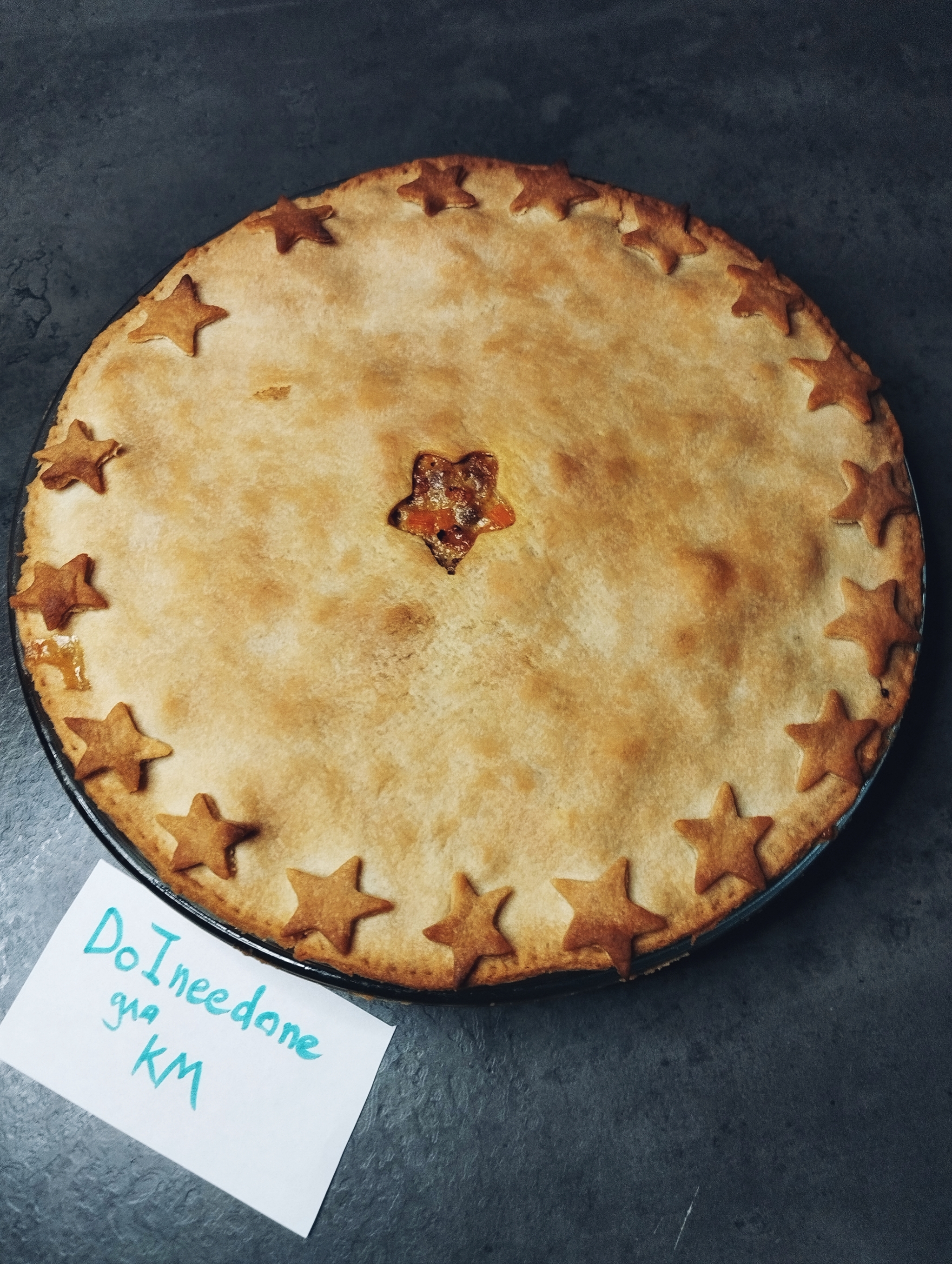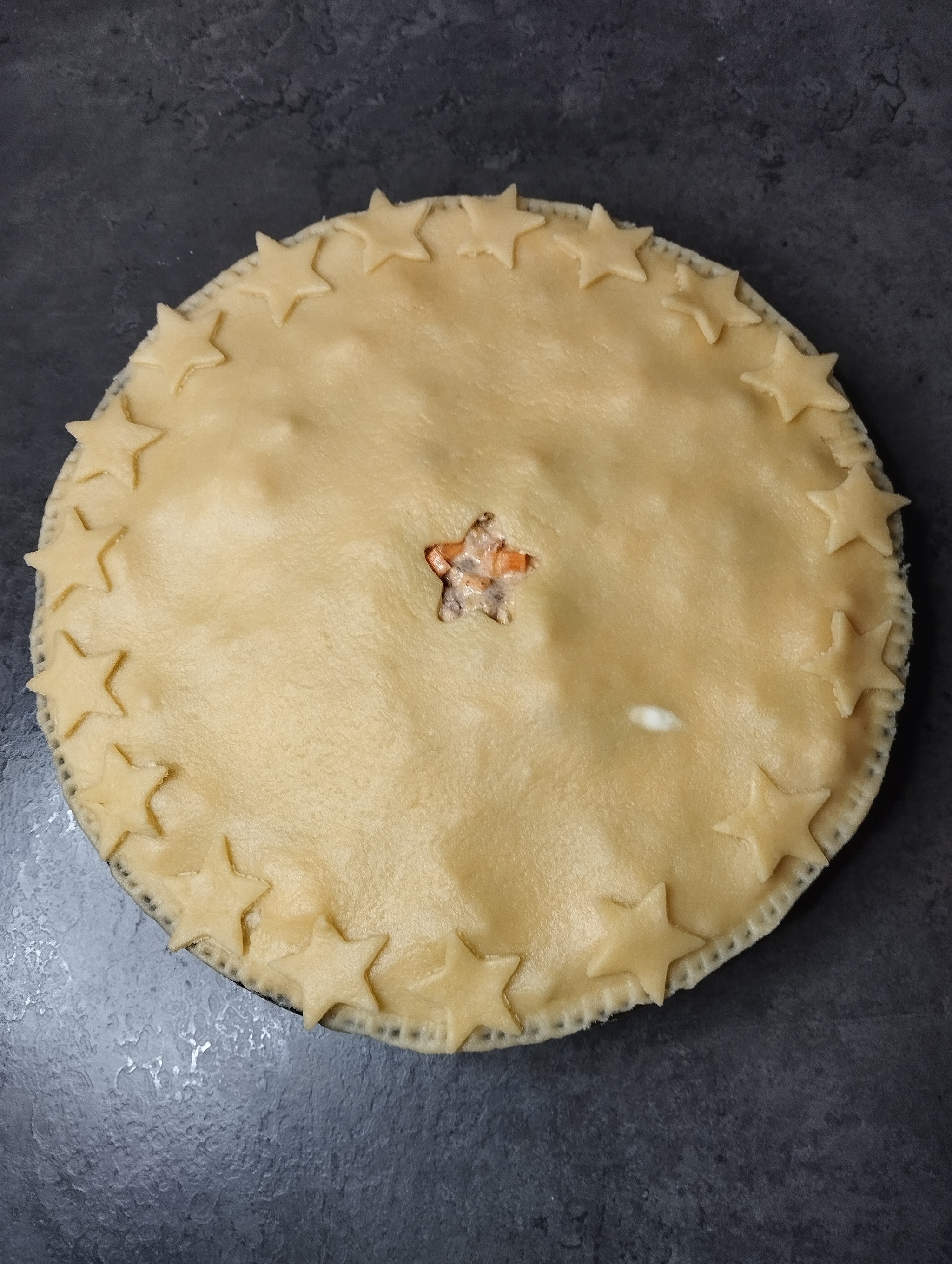 Оставшееся тесто снова раскатываем в тонкий пласт и делаем разрез посредине (я вырубкой сделала звёздочку). Выкладываем тесто на начинку. Из оставшегося теста я сделала звёздочки и разложила их по краям.