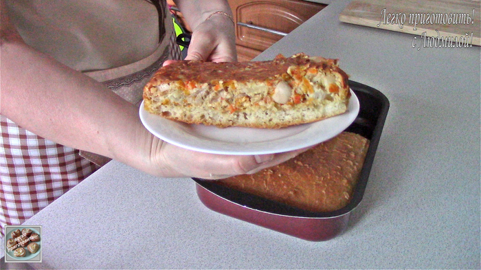 Сразу после выпечки поверхность пирога твердая, но когда пирог начинает остывать, то и поверхность пирога становится мягче. Когда пирог остынет до теплого, нарезаю его на куски и перекладываю на тарелку переворачивая начинкой вверх. Если пирог оставить в форме и не перевернуть, то после остывания румяная поверхность начинки станет влажной.