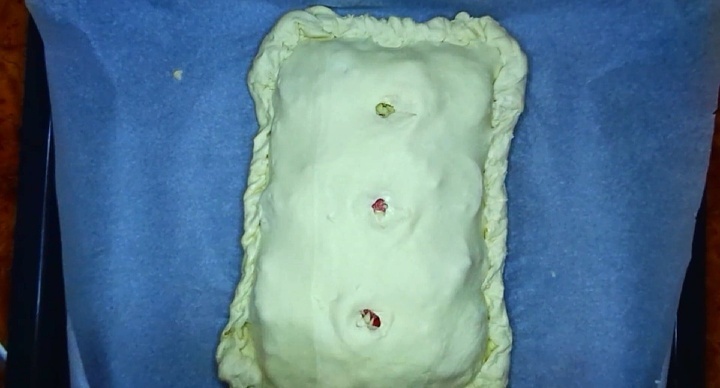 Накрыть пирог вторым слоем теста(тесто раскатать также как и первый пласт) защипываем края.
