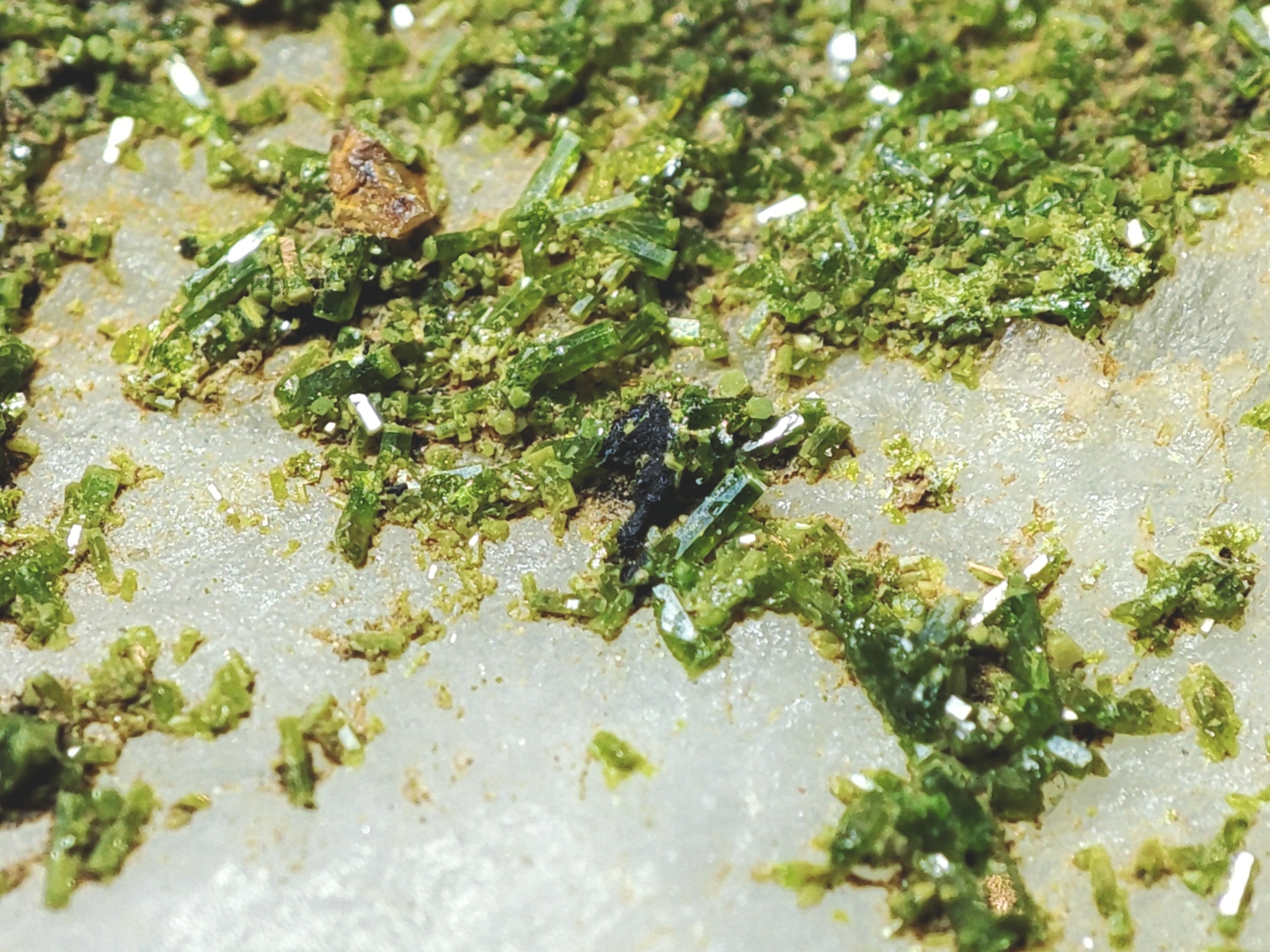 Щётка кристаллов пироморфита Pb5(PO4)3Cl на кварце. Южный Урал.