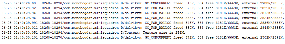 Однако когда я начал отлаживать игру на смартфонах, я заметил резкие просадки кадров и абсолютно нестабильный FPS. При этом характер лагов был константный: раз в 2-3 секунды просадка в 20 кадров. Заглянув в logcat, я обнаружил что Dalvik постоянно вызывает GC (сборщик мусора) и блокирует все потоки на невероятные 16мс — даже для простейших объектов в «куче»! В зависимости от устройства, Dalvik выделяет от 8 до 32Мб памяти для каждого приложения - что очень немного!
