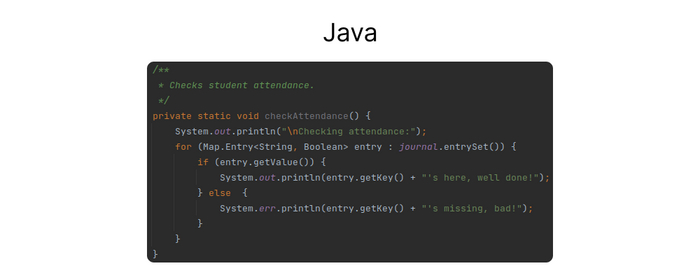 Мне кажется, выглядит довольно прикольно. Теперь давайте протестируем работу HashMap. В этом примере распечатаем HashMap с информацией о посещении учеников учебного заведения: