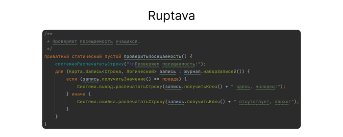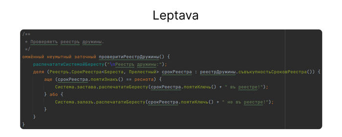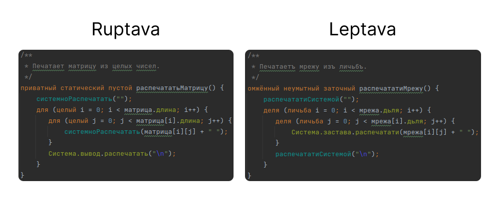 А вот так она будет выглядеть на языке ruptava и leptava (пример с goptava не приводил из-за большого количества нецензурной лексики):