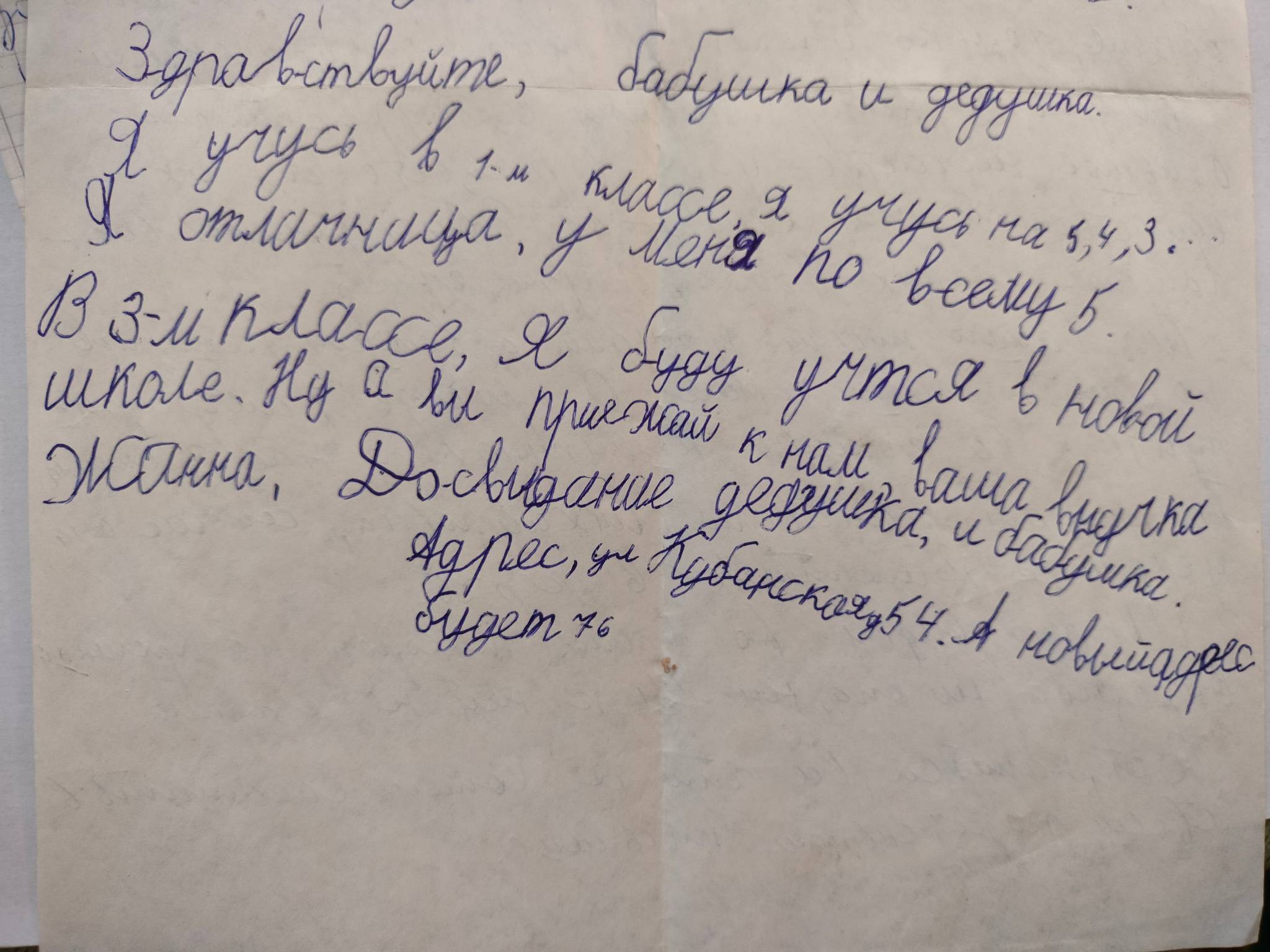 Здравствуйте, бабушка и дедушка. Я учусь в 1-м классе, я учусь на 5, 4, 3. Я отличница, у меня по всему 5. В 3-м классе я буду учится в новой школе. Ну, а вы приезжай к нам, ваша внучка Жанна. Досвидание дедушка, и бабушка. Адрес, ул. Кубанская 54. А новый адрес будет 76.