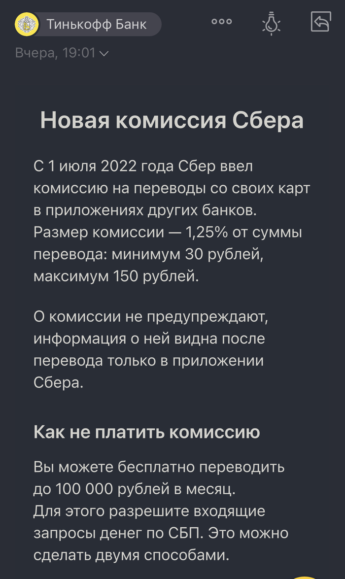 5 feNeFe Письмо от банка 3 года назад Вот такое письмо пришло вчера. Начал читать и показалось странным. Особенно раздел, как не платить комиссию, только тогда посмотрел на отправителя) Сбербанк Т-Банк Почта Комиссия Ещё 0