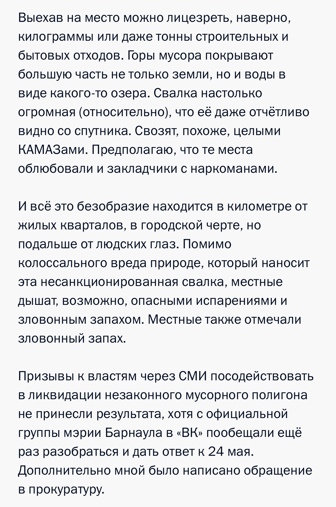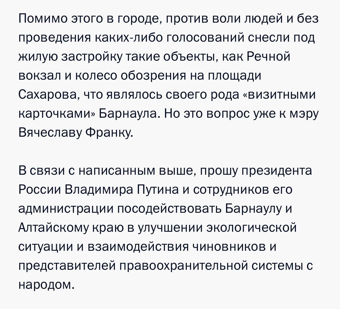 Сегодня мной было подано обращение на сайте Кремля к президенту России Путину и сотрудникам его администрации. В нём я описал ситуацию с экологической обстановкой в Барнауле и Алтайском крае, о реакции властей и правоохранителей на неё и ещё несколько моментов. Всё можете прочитать на скриншотах.