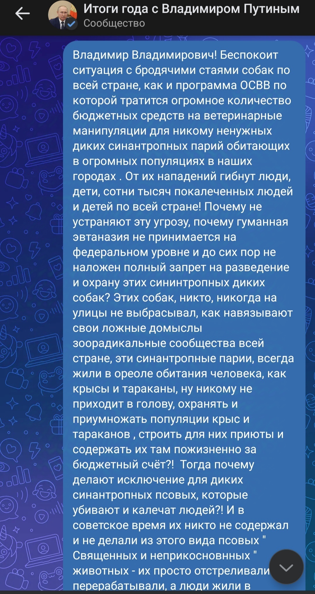 19.12.2024 прямая линия с Владимиром Владимировичем Путиным. Зоозащитники уже активизировались. Давайте не останемся в стороне и создадим прецедент? Писать можно сюда https://vk.com/im?sel=-115987924