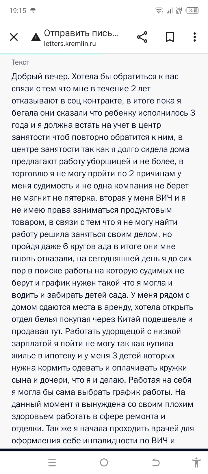 Одна хорошая знакомая вчера написала письмо Президенту РФ, я попросил ее скинуть мне скрины и разрешение выложить на пикабу. Ситуация описана в скринах. Мне интересно что из этого выйдет и ваше мнение.