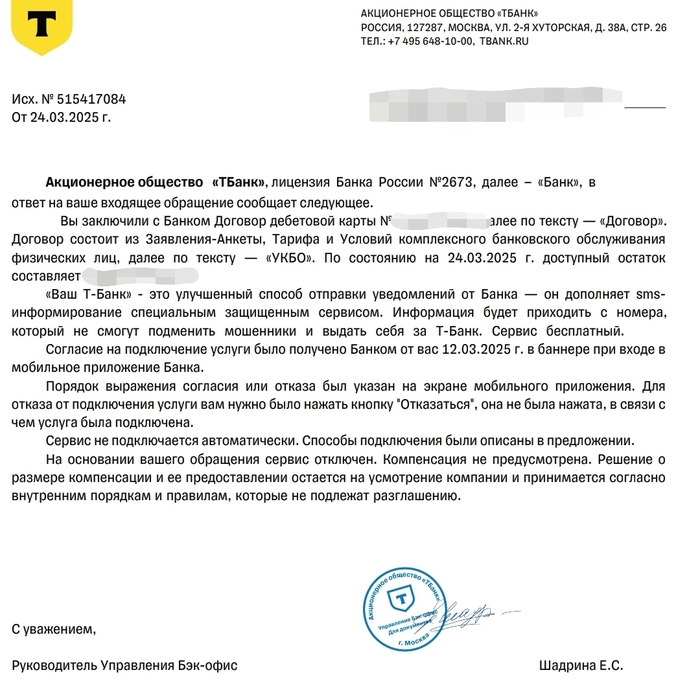 Итак, ответ от Т-Банка получен и он, как ожидалось, отрицательный: