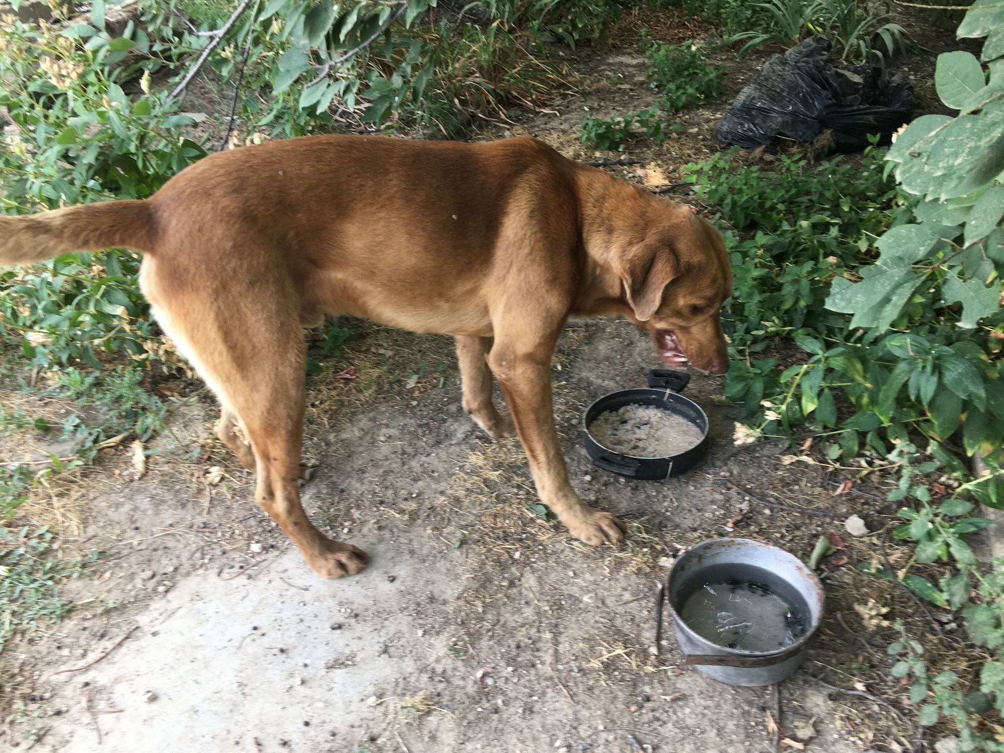 Ну, а я этого пса зову Рыжим. Ему всегда выставляю воду, меняя её два раза в день, потому что в ней любят купаться воробьи и после них она очень грязная. Когда есть чем угостить, ставлю миску с едой. Съедает всегда всё, можно посудину не мыть.