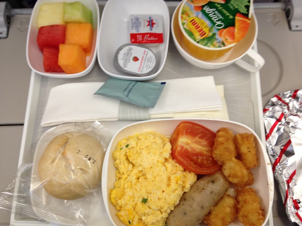 А это уже второе кормление, на подлете к Мюнхену. Скорее, как завтрак: омлет с помидоркой (как в лучших домах Лонд'она), фруктовый салат (виноград, яблоко, персик, груша, 2 вида ДЫНИ), масло, джем.