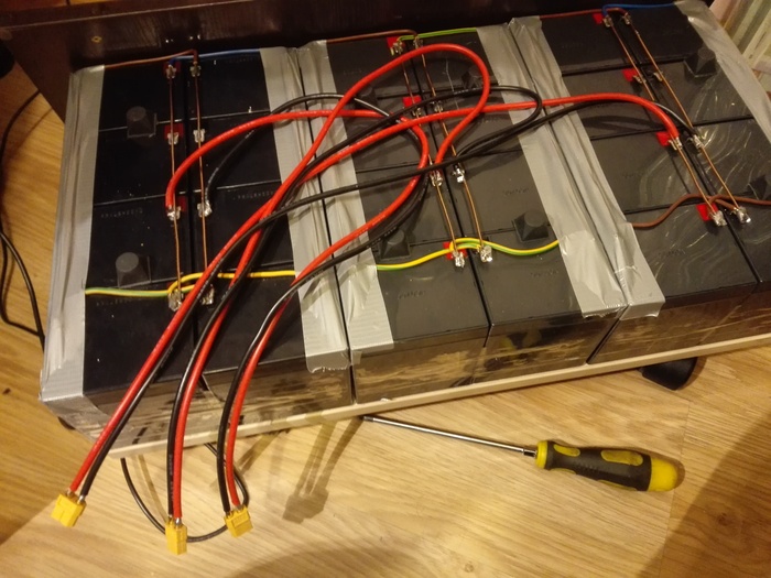 Аккумуляторная сборка на ~120а*ч собранная из отработавших регламентный срок в ИБП аккумов с номиналом по 5а*ч которые выбирал из из целой кучи по внутреннему сопротивлению и промеру ёмкости.
