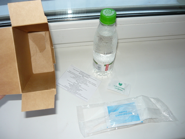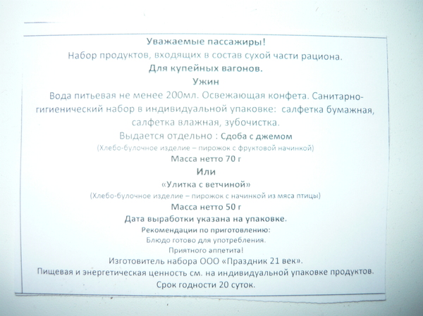 У нас были места в купе за 3300 руб. Цена в купе выше плацкарты отчасти потому, что в купе предусмотрено питание. Предлагаю посмотреть на дивный ужин. Фоткал уже из дома, в ту ночь посмотрел, что положили попутчикам, посмеялись и легли. Вот такая коробочка: