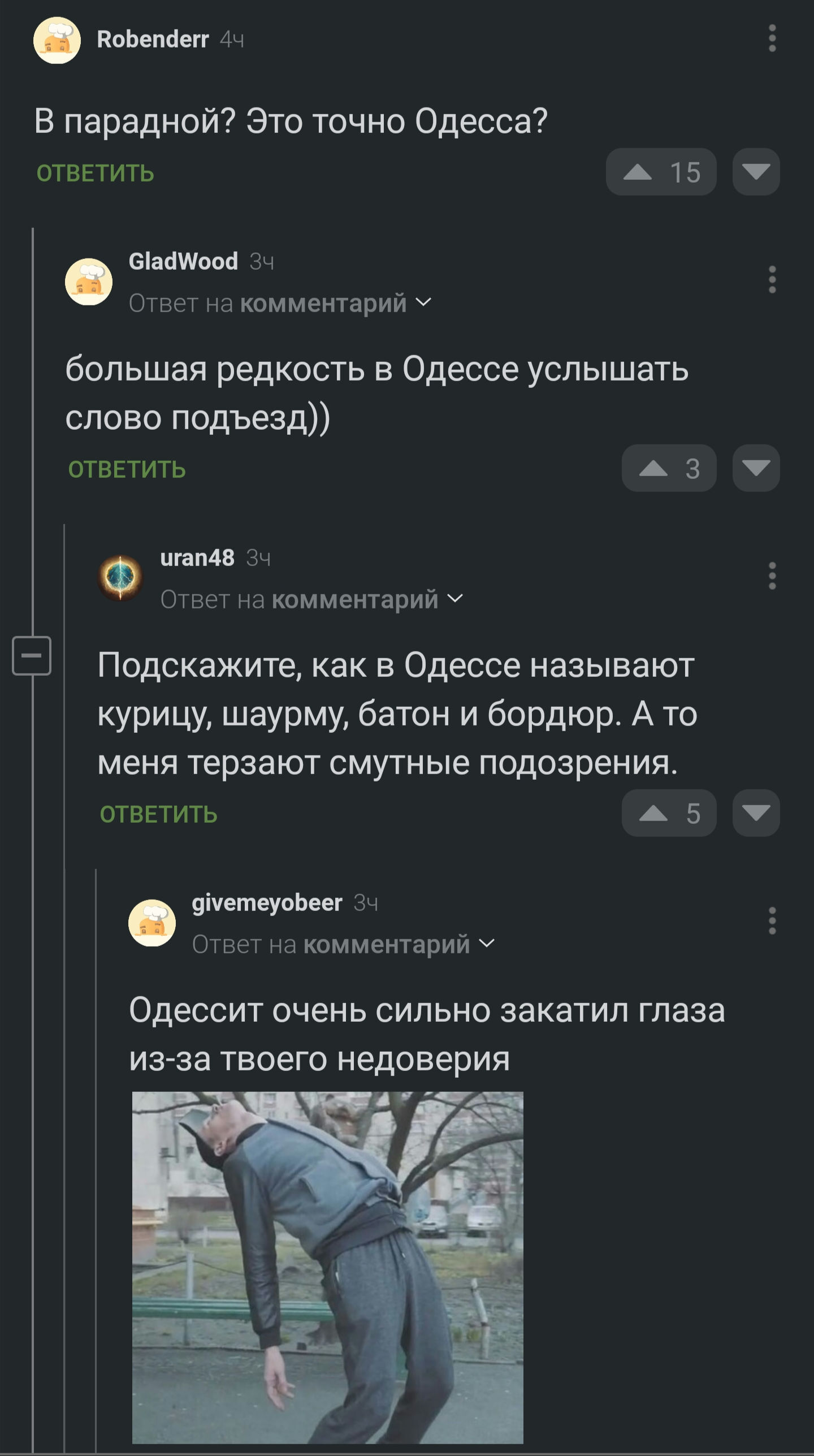 10 dcdent87 Питер или таки Одесса? 1 год назад #comment_291499111А там правда так же говорят? Или только артисты кланяются в обратную сторону? Комментарии на Пикабу Одесса Санкт-Петербург Скриншот Ещё 0