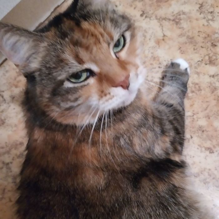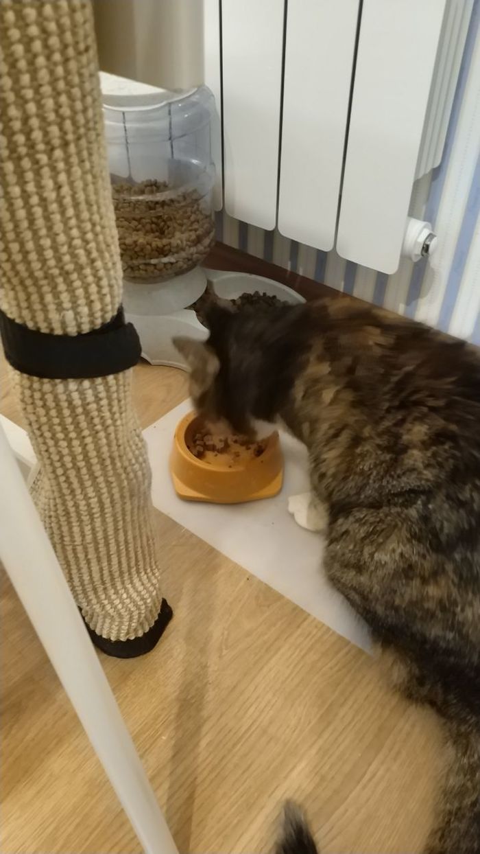 Кошке уже почти 4 года, она стелеризована. Есть небольшая проблема с зубами (такой уже подобрали), поэтому почти не ест сухой корм, а так всеядна.