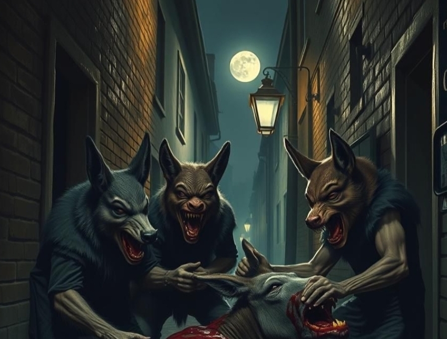 Кто-то лежал на земле. И над ним склонились другие. Сверху, на втором этаже, открылось оконце, и оттуда посветили. Макс не успел поднять глаза, потому что оказавшееся впереди него всецело завладело его вниманием. Лежавший оказался человеком; но не простым, а словно в карнавальной маске – взамен обычной человеческой головы на шее сидела ослиная. Склонившиеся над ним услышали чьё-то приближение и сразу подняли… морды. С виду все четверо походили на людей. Ну, разве что были не в самой современной одежде, однако выдававшей в её носителях чётко пол – мужской, без всяких там двусмысленностей. Но вместо привычных лиц и голов на Макса смотрели именно морды, звериные – две лисьи, большая кабанья и косматая волчья. С острых клыков стекала густая тёмная кровь. Терзаемый ими слабо застонал, попробовал пошевелиться, а затем отползти в сторону. Однако, с рыком, двое тут же пригвоздили его клыками обратно, а двое других начали подниматься. Сверху, в оконце, послышался лёгкий вскрик. Лампа выскользнула и полетела вниз.