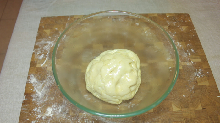 Берем 2.5 ст. муки и просеиваем их через сито. Вливаем в муку 3 ст.л. оливкового масла и раствор дрожжей. Замешиваем тесто. Разумеется, сначала, пока оно жидкое, удобнее это делать ложкой. Когда тесто достаточно загустеет, продолжаем месить его руками. Когда тесто вымешано, кладем его в глубокую миску, покрываем оливковым маслом и накрываем влажным полотенцем. Ставим тесто в тёплое место, чтобы оно взошло, на один час.