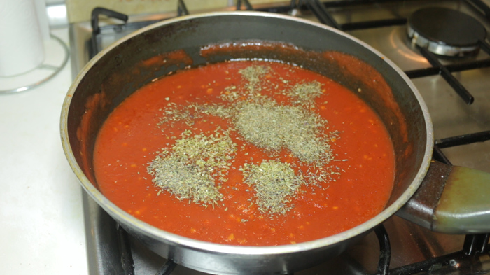 Настало время одарить соус настоящими итальянскими ароматами! Для этого отправляем в сковороду 1 ч.л. орегано и 1 ч.л. базилика. Перемешиваем содержимое сковороды. Уменьшаем огонь, доводим соус до желаемой консистенции. Примерно на это уйдёт около 15 минут. Чтобы не терять время даром, подготавливаем сыр.