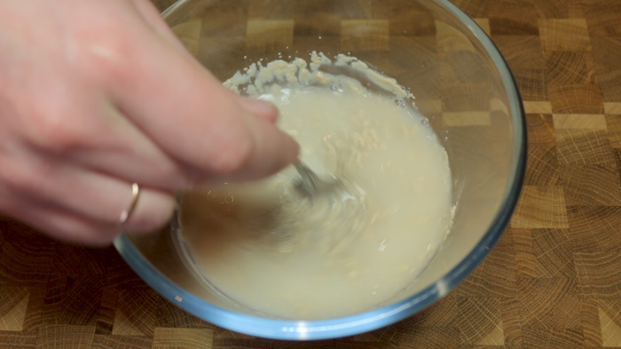 В глубокую миску наливаем 1ст. тёплой воды. Добавляем 1ч.л. соли, 1ч.л. сахара и 10гр. дрожжей. Перемешиваем содержимое миски. Оставляем миску на 10 минут, чтобы дрожжи заработали.