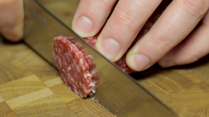 Мы подошли к самому важному ингредиенту пиццы пепперони, это колбаса пепперони. Найти её можно не везде, но без неё данная пицца не получится, поэтому сделать это необходимо! Нарезаем колбасу тонкими ломтиками.