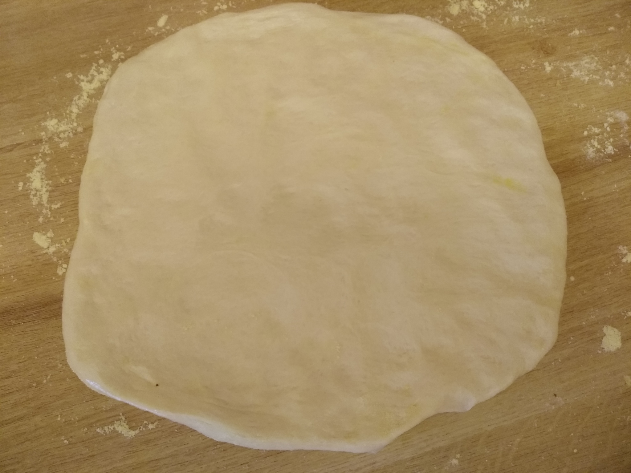 Переложите на бумагу для выпечки, присыпанную кукурузной мукой. Выпекайте при температуре 250C, на камне для пиццы, 6 минут. Выньте из духовки.