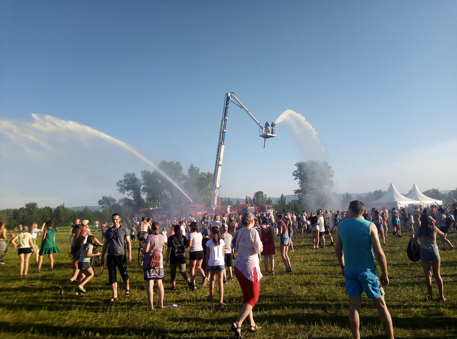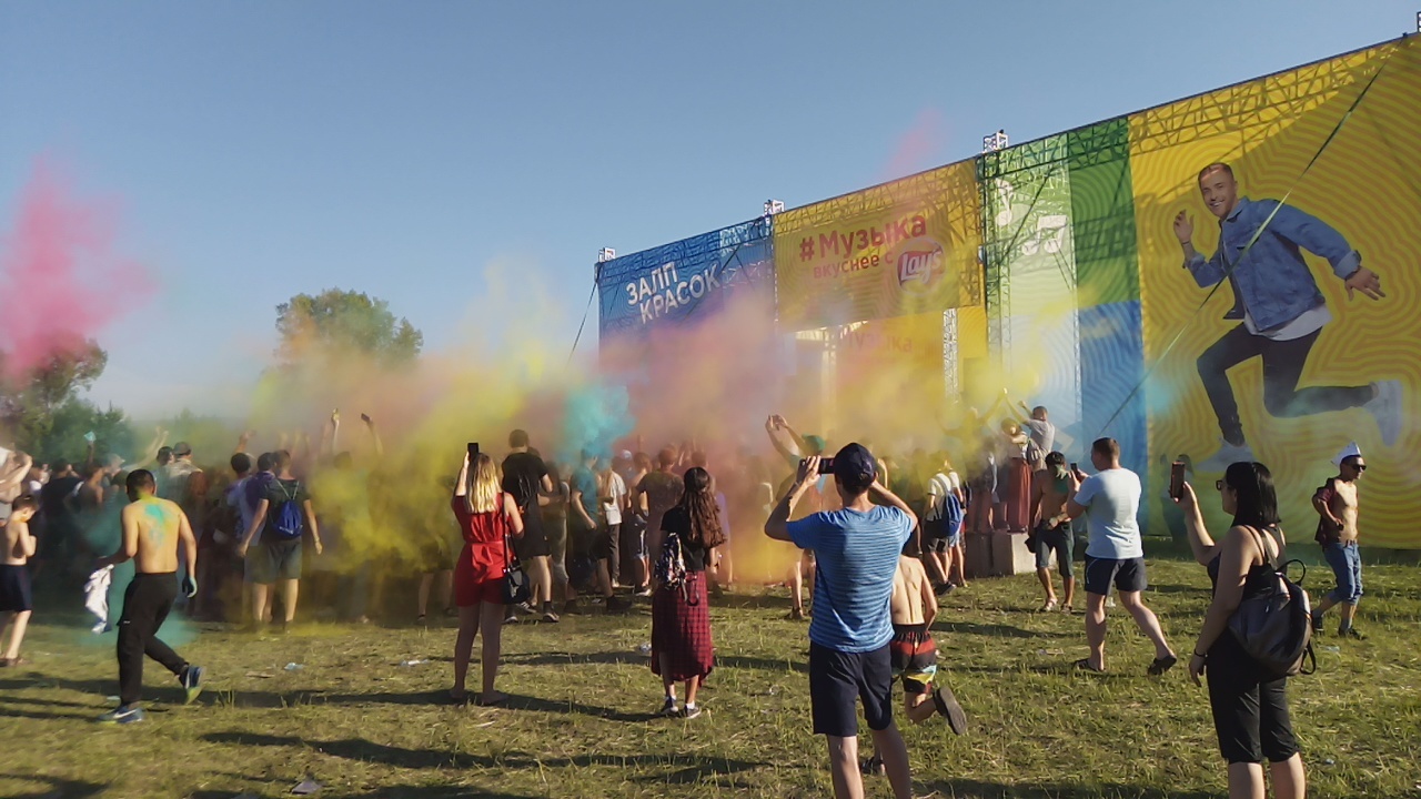 Пока был в городе - гулял, был на летнем фестивале Зелёный, что проходит на острове Татышева, да и, наверное, особо больше нечего рассказывать)) В день фестиваля на улице было +30. Жара, духота, потому я выбрался уже ближе к вечеру))) Но были крутые моменты))) Можно было облиться холодной водой с пожарной машины))) Ну и сразу расскажу - у нас там в парке оч большая площадь газонов, где и были выставлены стенды, конкурсы, лавки сувениров и тп. Ну и на этих газонах люди устраивают пикники, загорают и тд)) Потому на фотках есть и люди в купальниках)) и да, водичка была холодной))) и перед душем был залп из красок))