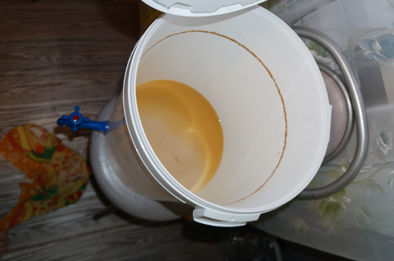 Пр процессу - самое главное - это стерильность. Вся посуда и приспособления стерилизуются либо раствором йода (10-15 мл. на 1 литр воды), либо перекисью водорода, либо бытовой химией типа белизны. Главное убить белковые формы жизни, дрожжи не любят конкуренции и сусло может скиснуть. Затем в стерилизованную емкость наливается вода из фильтра/скважины/родниковая (самая вкусная вода, которую вы можете добыть) около 17 литров. Экстракт сусла разогреваетеся на водяной бане, так он лучше течет, и добавляется в воду. Килограмм глюкозы растворяется в кипящей воде и добавлятется в ту же емкость. Глюкоза либо декстроза нужна для того, чтобы в нашем пиве был алкоголь, чем больше добавим тем оно будет пьянее. Если вместо глюкозы добавить сахар, привкус должен получиться бражным, сам не проверял, использовал глюкозу. Если вместо глюкозы добавить неохмеленный экстракт сусла, из которого дрожжи также сделают спирт, вкус должен получиться более насыщенным, но более дорогим, за литр будет выходить около 130 руб.