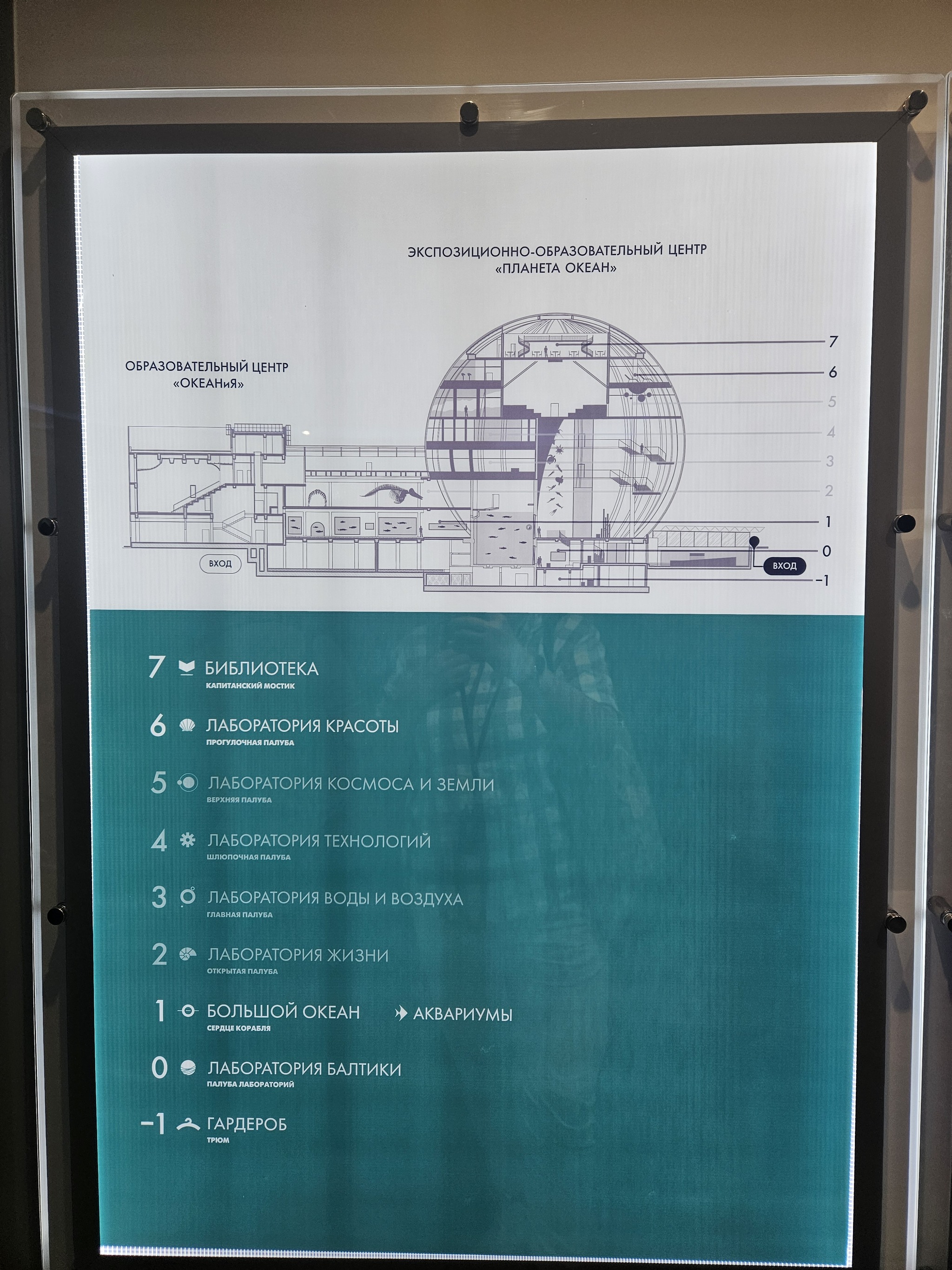 Как я понимаю, пока доступны далеко не все экспозиции, но уже виден масштаб и размах. Были доступны для посещения экспозиции: «Лаборатория Балтики», «Большой океан» и аквариумы. В лаборатории можно посмотреть в довольно мощные микроскопы, а также узнать, чем богат янтарный край, в аквариумах собраны морские обитатели со всего мира, ну а в довершение нас ожидал огромный зал со столь же огромным экраном. Полагаю, в будущем, будет ещё много всего интересного. В том, числе, на сколько я знаю - планетарий. В общем, ждем, полного запуска!