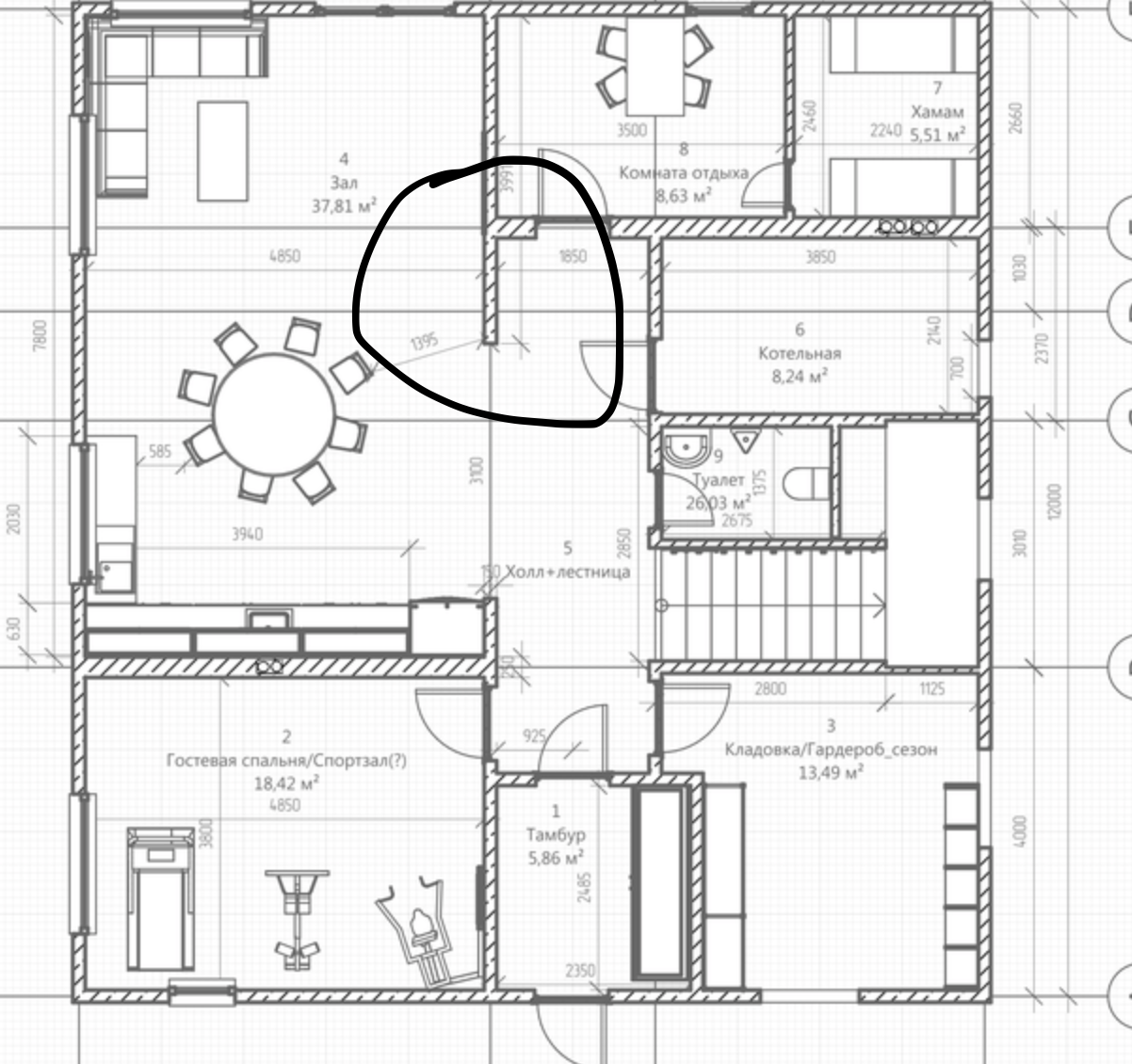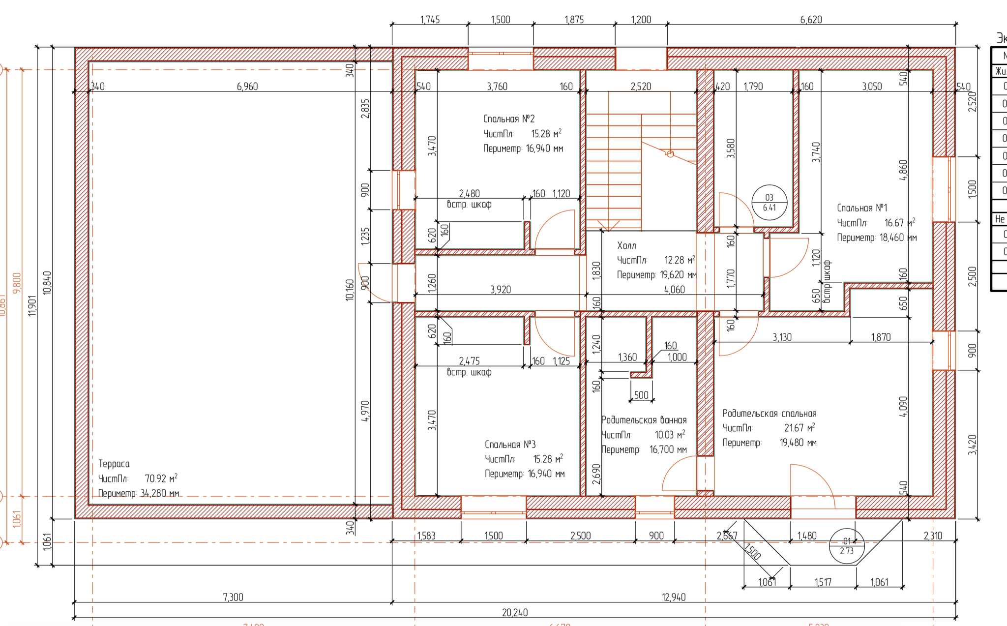 Меня смущает проход между залом и холлом 3100мм. Может меньше нужно? Или наоборот. В итоге выбрал, имхо оптимальный. Но пролет в том месте получается 6700мм. Но это вопрос уже к конструктору?
